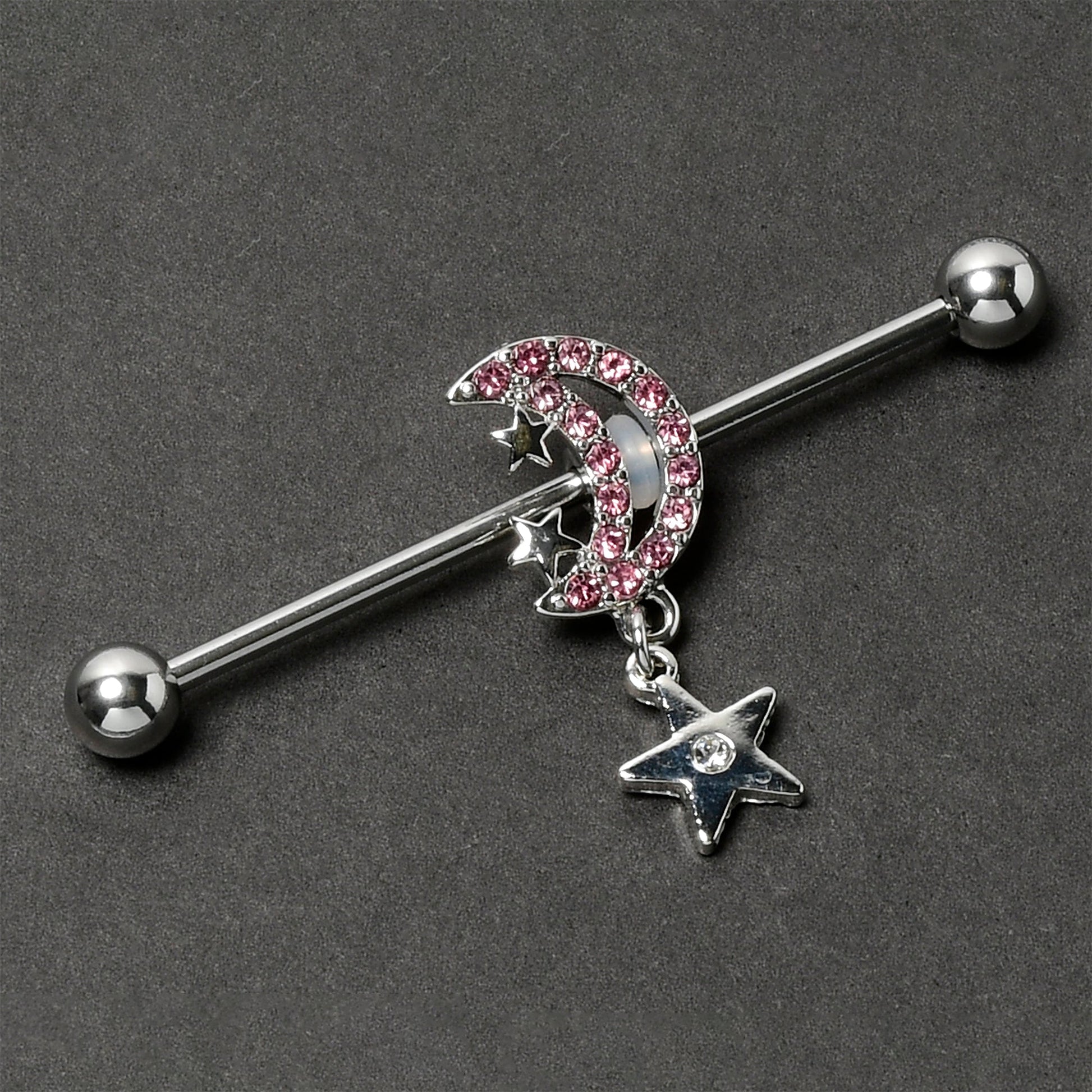 Give your industrial piercing a look as lovely as the night sky with this 14 gauge helix barbell. It is made with a 1 1/2 inch 316L surgical grade stainless steel straight barbell with 5mm ball ends. It features a crescent moon charm, embellished along the edge with pink cubic zirconia gems and tiny stars. Dangling beneath is another star with a clear cubic zirconia gem at the center. You can even slide it up and down the length of the barbell for the perfect look. You will feel like a star with this celestial themed barbell earring.Specifications