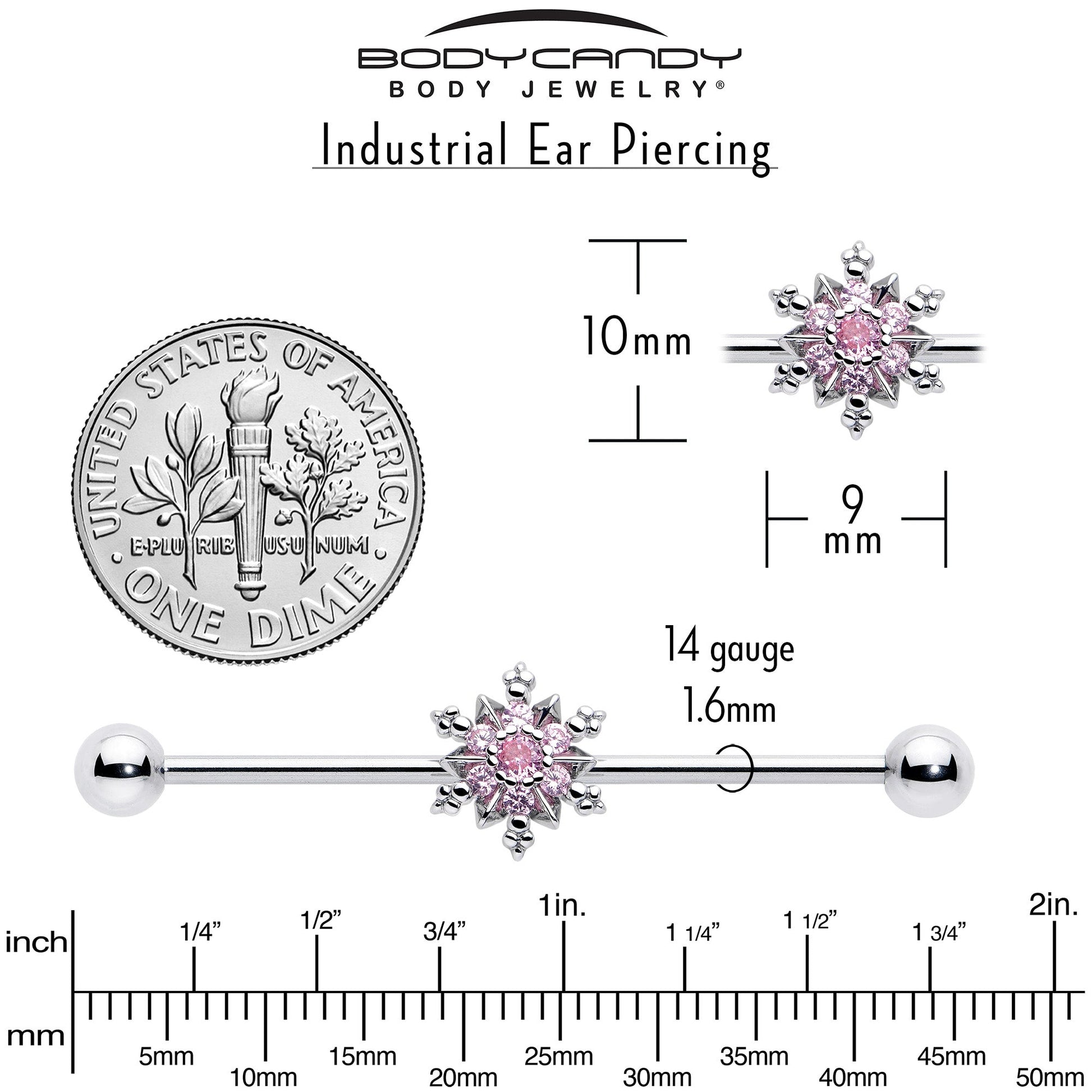 14 Gauge Pink CZ Gem Snowflake Glam Industrial Barbell 38mm