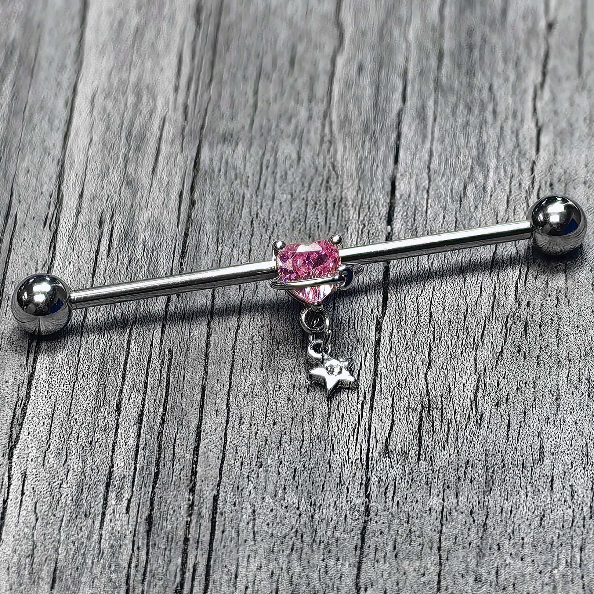 This 14 gauge helix barbell is out of this world. It is made with a 1 1/2 inch 316L surgical grade stainless steel straight barbell with 5mm ball ends. It features the planet Saturn, with the planet composed of a single heart shaped pink cubic zirconia gem and ring. Beneath the planet dangles a small star charm, set with a clear cubic zirconia gem for an added touch of style that you can slide up and down the length of the barbell for the perfect look. This heavenly body is sure to make your industrial piercing a star with this celestial-themed barbell earring.Specifications