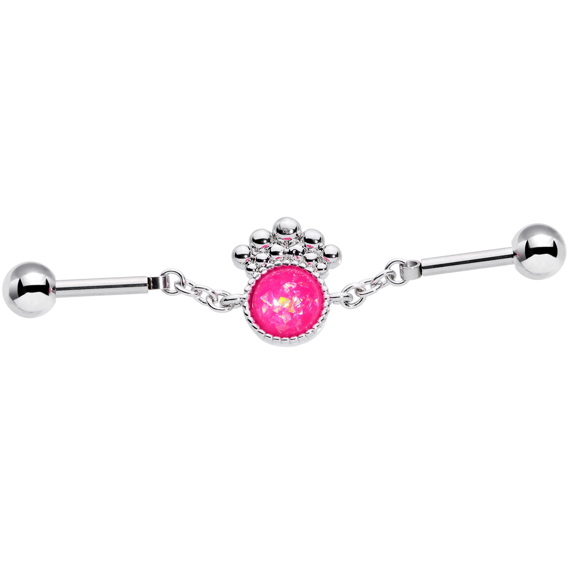14G Pink Faux Opal Crest Chain Dangle Industrial Barbell 38mm