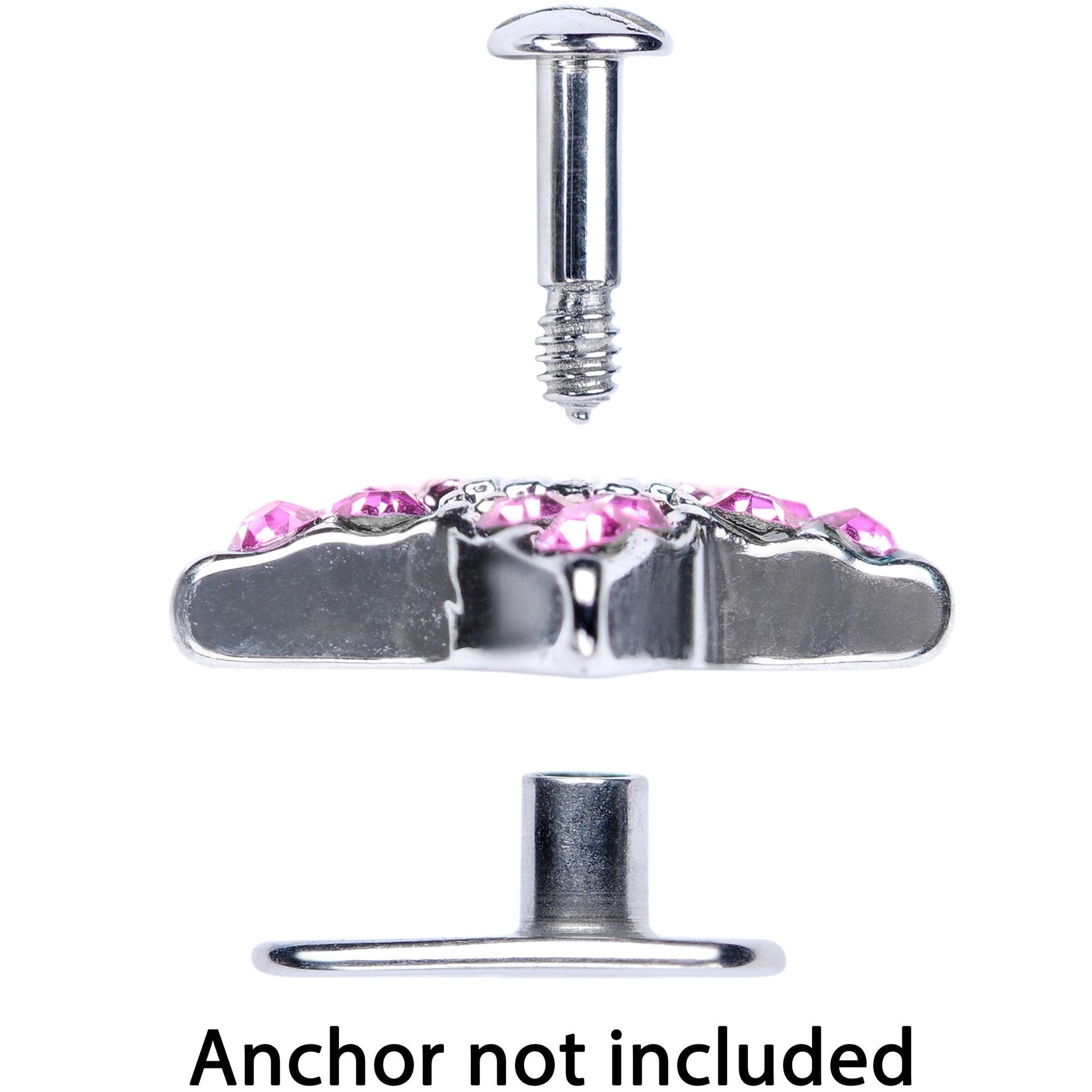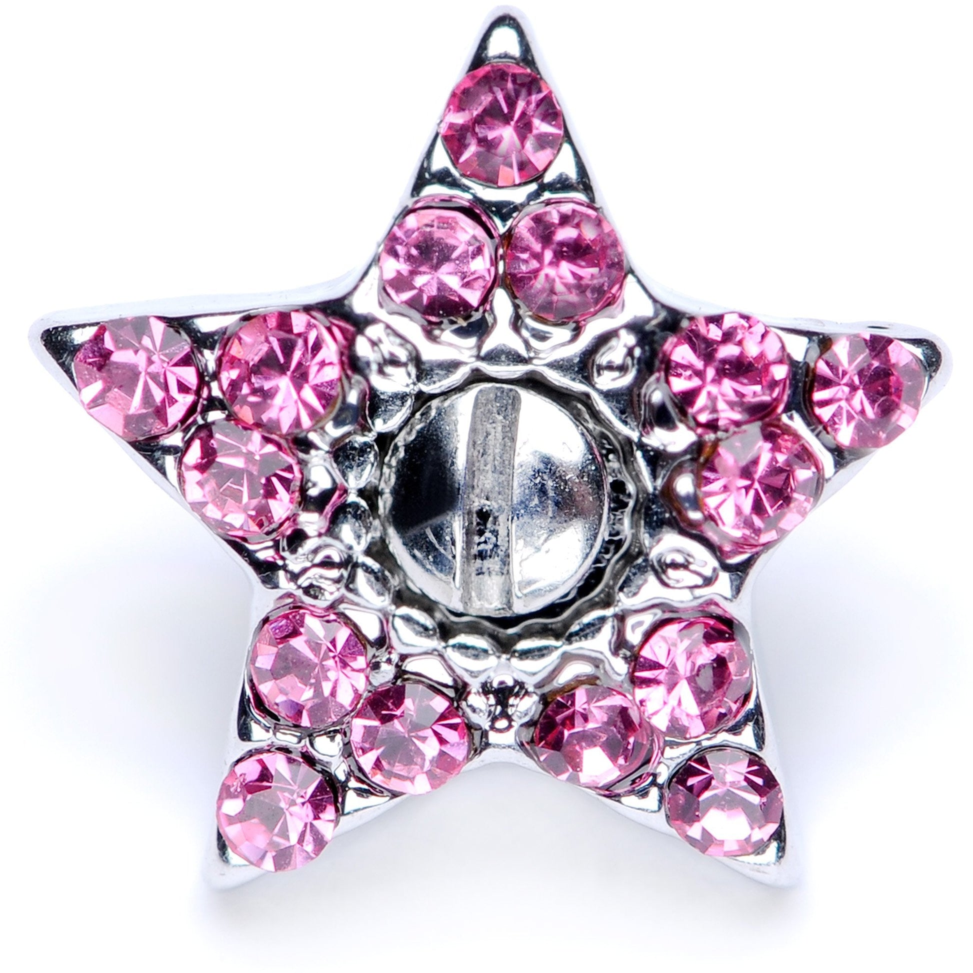 Looking to add some flair to your surface piercing? This dermal top is bursting with flair, with a 10mm pink gem encrusted five-pointed star as its focus. This star-shaped dermal top features a 14 gauge externally threaded dermal screw made with durable 316L surgical grade stainless steel, which screws into your surface anchor. Anchor not included.Specifications