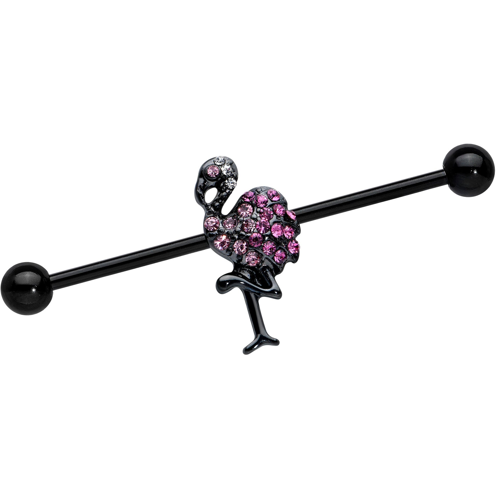 The flamingo on this 14 gauge helix barbell has style to spare! It's made with a 1 1/2" black PVD over 316L surgical grade stainless steel straight barbell with 5mm ball ends. It features a flamingo charm standing in its iconic one-legged pose. It's set with hot pink gems and further embellished with lighter pink gems for contrast. You can even slide the flamingo up and down the length of the barbell for the perfect look! Let this bold bird lend its style to your industrial piercing with this fantastic flamingo barbell earring!Specifications