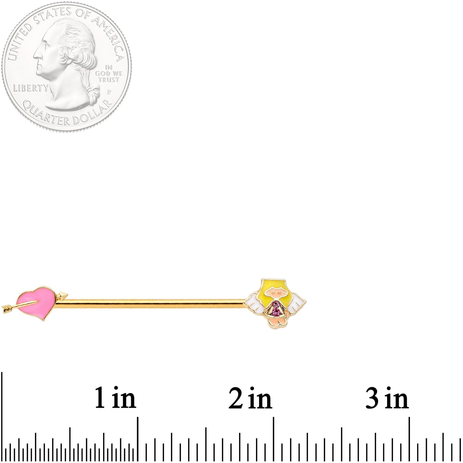Cupid's arrow is flying your way to make you fall in love with this 14 gauge industrial earring! It's made with a 1 1/2" gold tone PVD over 316L surgical grade stainless steel straight barbell. One end is shaped like a heart, pierced with an arrow and inlaid in pink for a bit of bright color. The other end is Cupid himself with yellow hair and white wings. He's set with two pink gems that will leave you lovestruck!