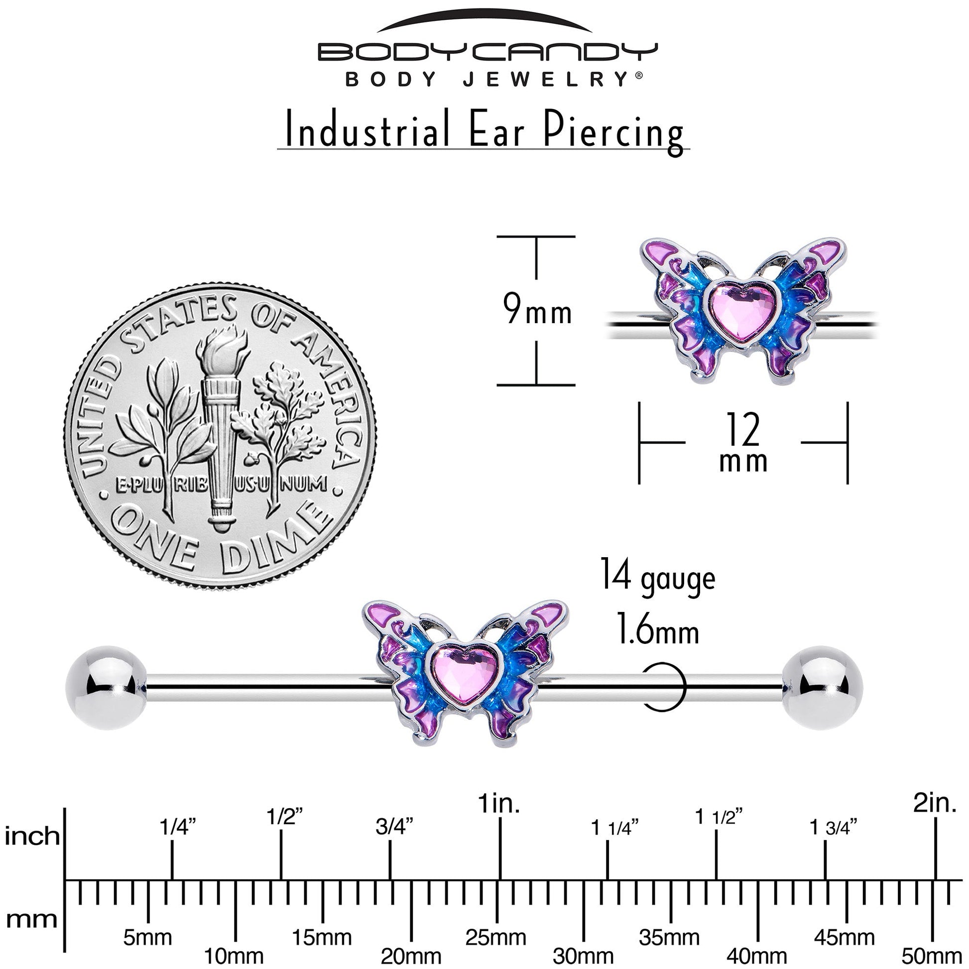 14 Gauge Pink Gem Heart Butterfly Purple Industrial Barbell 38mm