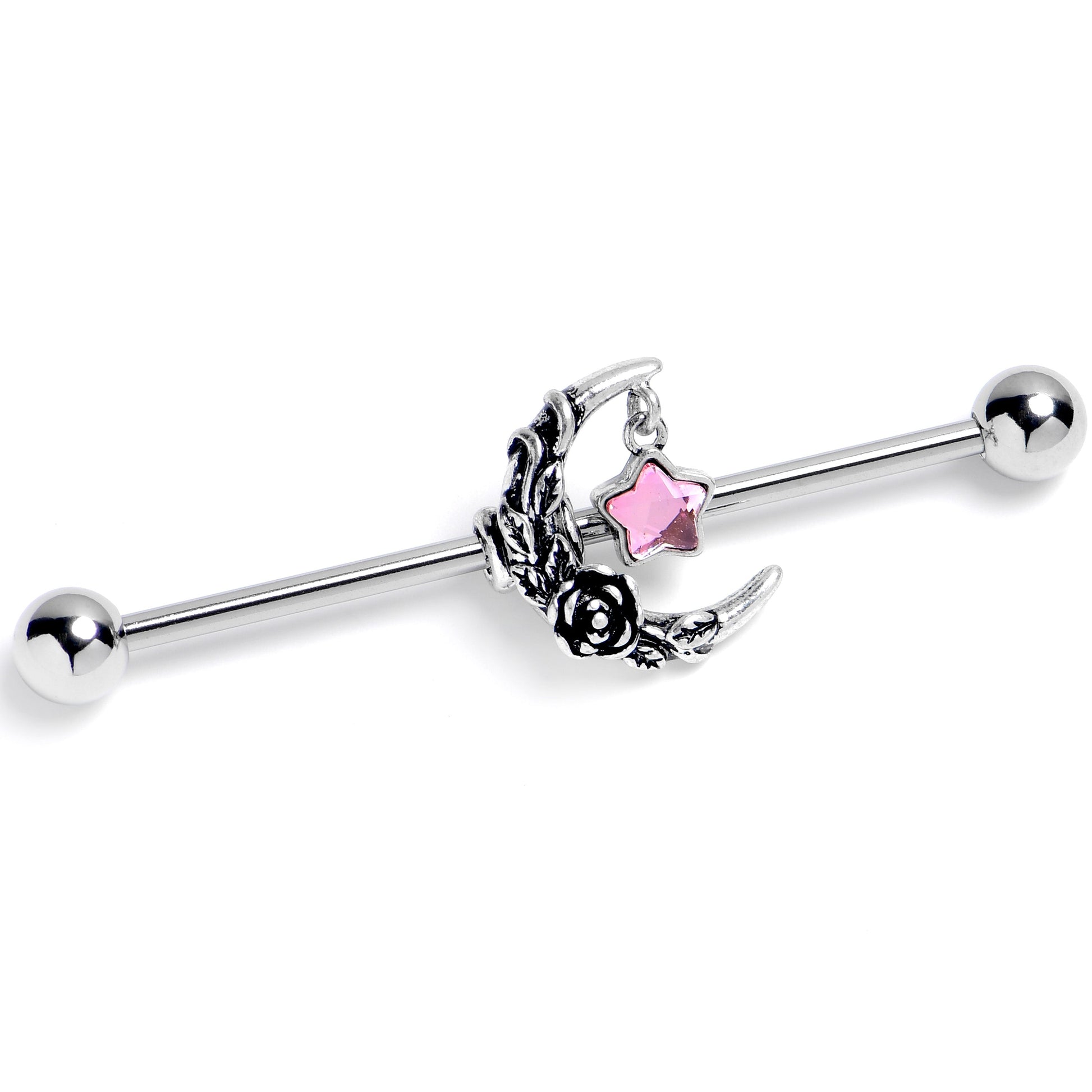 14G Pink Gem Ornate Moon Star Industrial Barbell 38mm