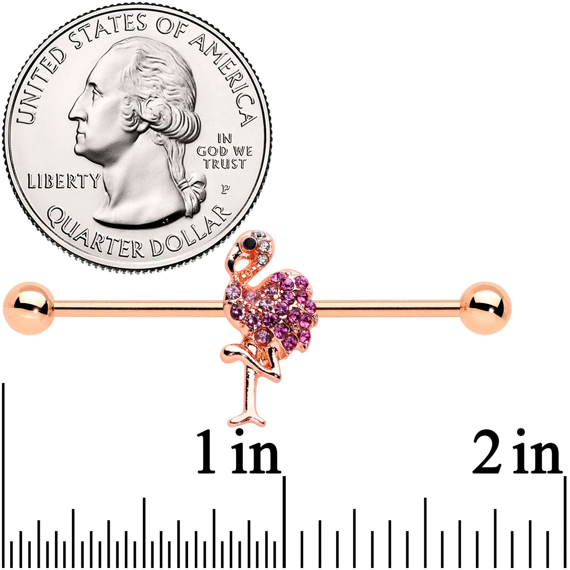 The flamingo on this 14 gauge helix barbell has style to spare! It's made with a 1 1/2" rose gold tone PVD over 316L surgical grade stainless steel straight barbell with 5mm ball ends. It features a flamingo charm standing in its iconic one-legged pose. It's set with hot pink gems and further embellished with lighter pink gems for contrast. You can even slide the charm up and down the length of the barbell for the perfect look. Let this bold bird lend its style to your industrial piercing with this fantastic flamingo barbell earring!Specifications