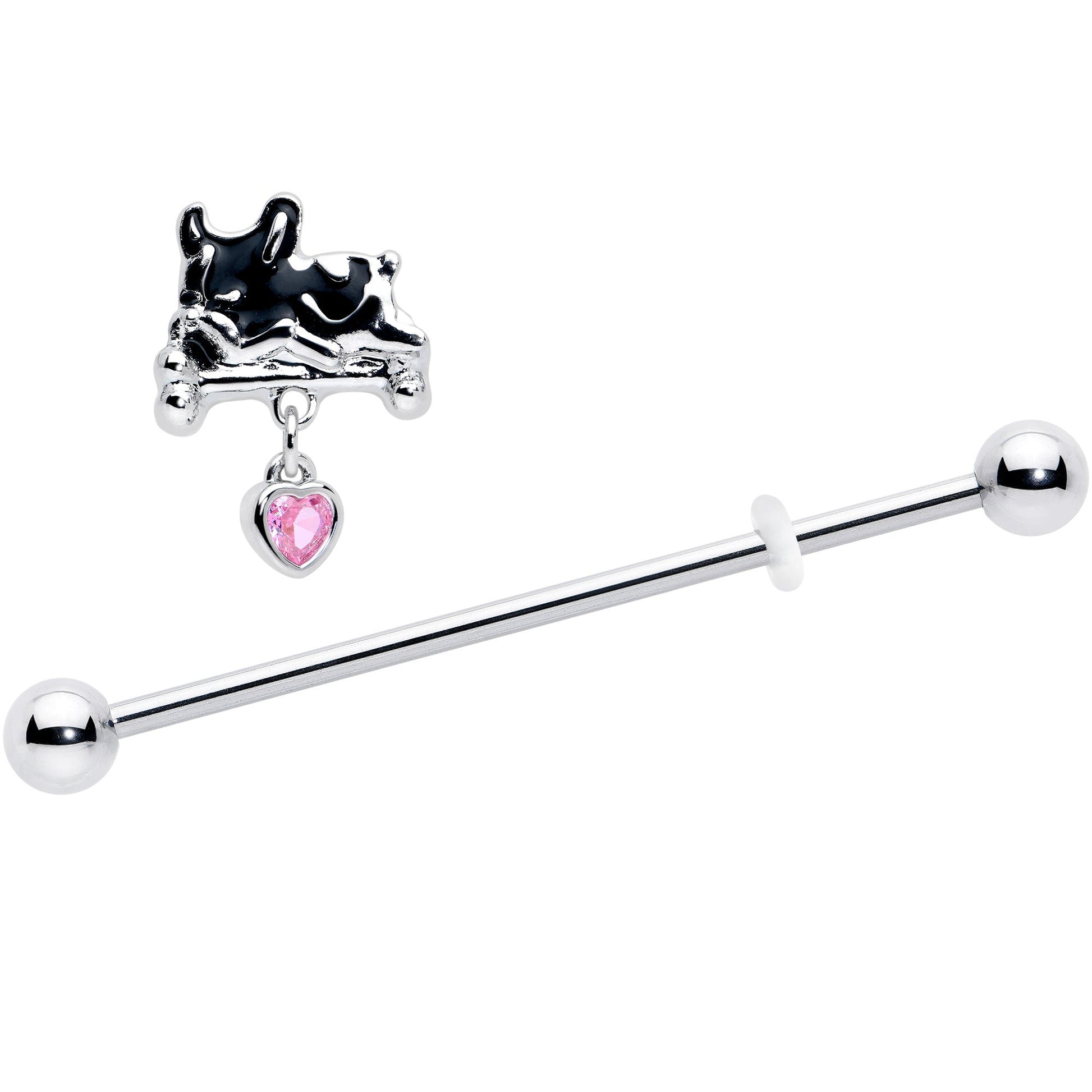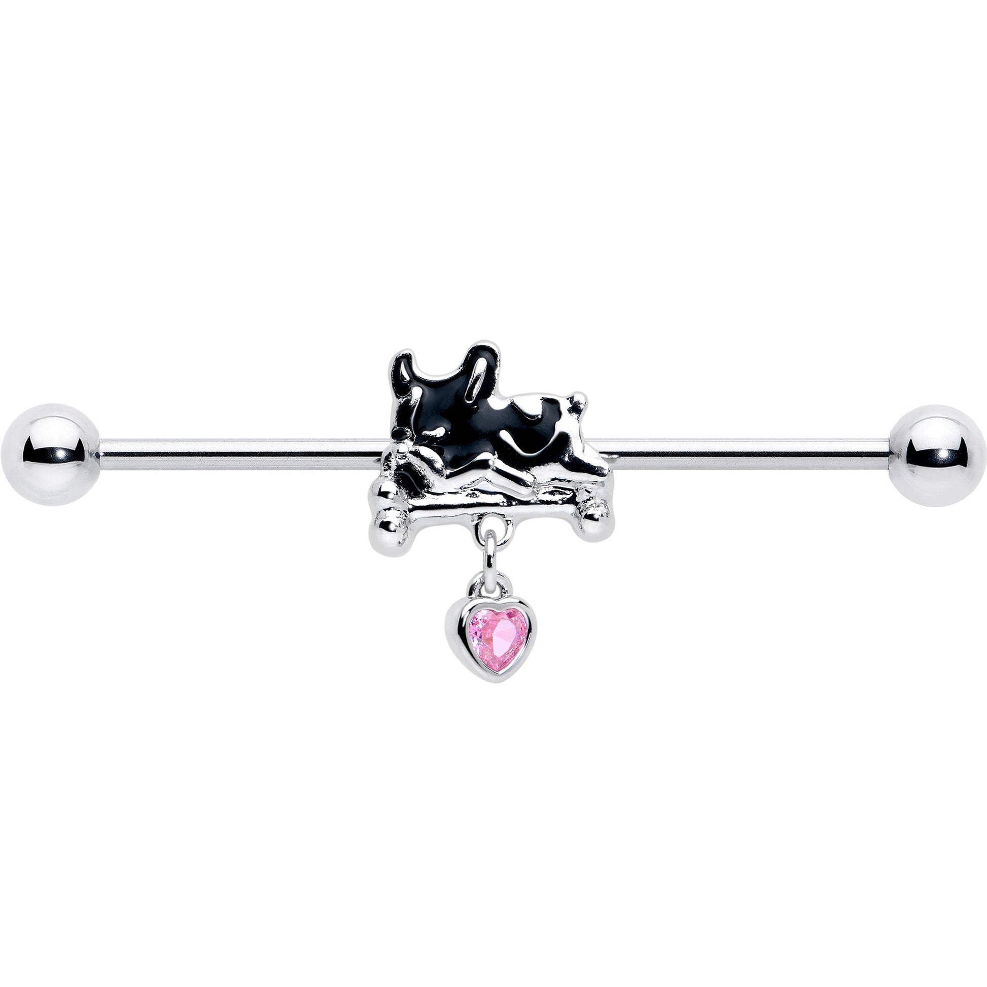 Get comfy and cozy while looking as cute as the dog on this 14 gauge helix barbell. It's made with a 1 1/2 inch 316L surgical grade stainless steel straight barbell with 5mm ball ends. It features a charm of a French Bulldog with graphic black and white colors, snoozing on a bed. Dangling beneath it is a pink gem heart so everyone knows how much you love these popular puppers and you can even slide it up and down the length of the barbell for the perfect look. You'll be ready to sit and beg for this adorable French Bulldog barbell earring.Specifications