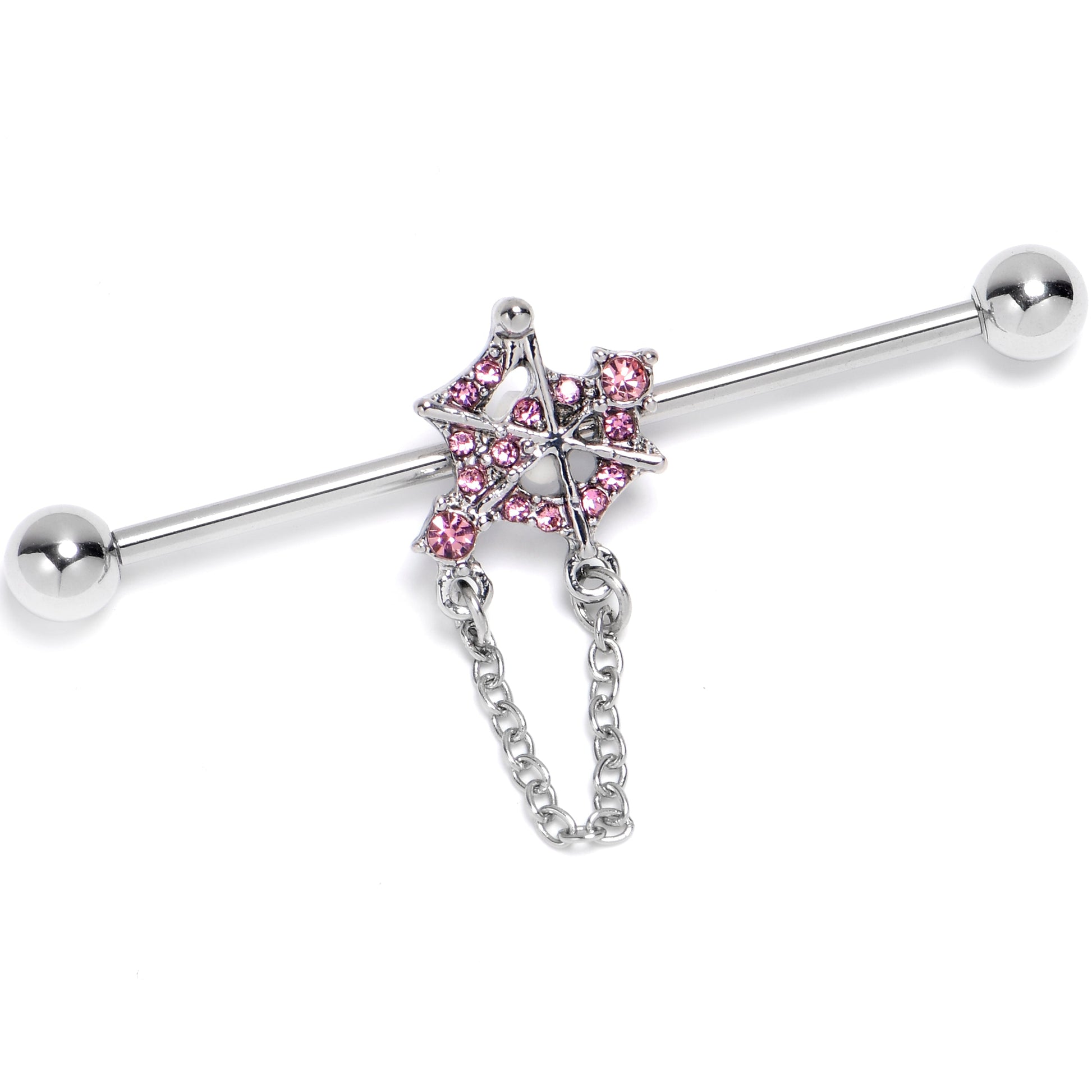 14 Gauge Pink Gem Spiderweb Chain Dangle Industrial Barbell 38mm