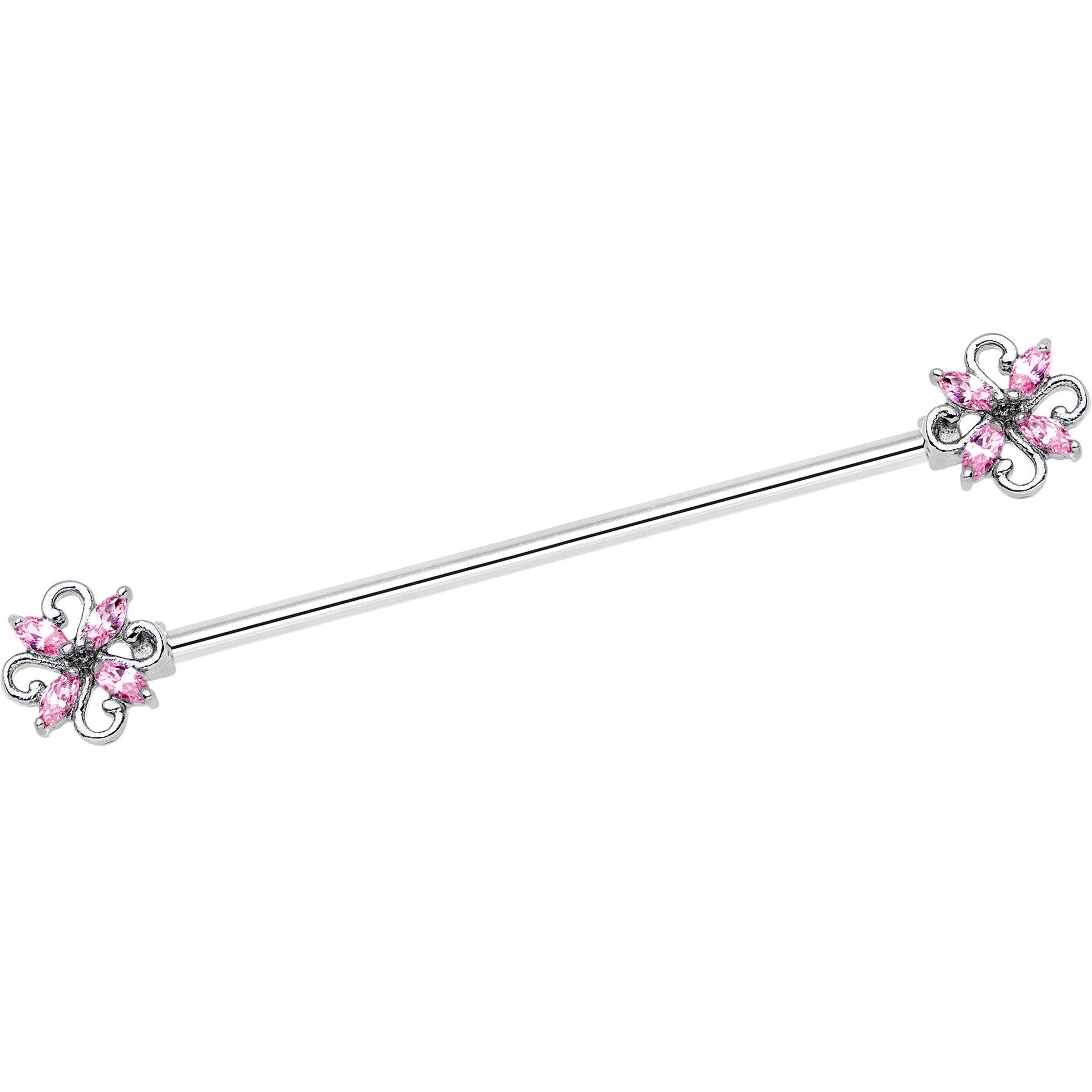 An elegant four petal flower formed from pink gems, inspired by the windmill flower, is like a wisp of beauty at the ends of this 14 gauge industrial barbell. The windmill flowers, complete with ornate metalwork spirals sit at the end of a 1 1/2" industrial straight barbell made with durable 316L surgical grade stainless steel. This simple, subtle piece can go with many styles and fashions.