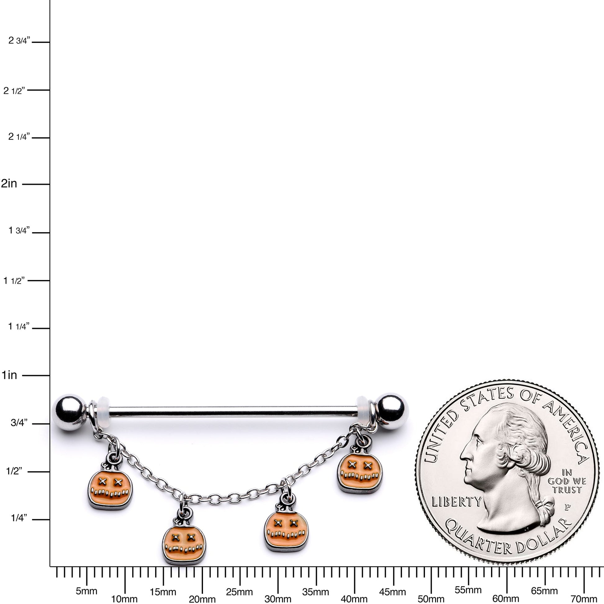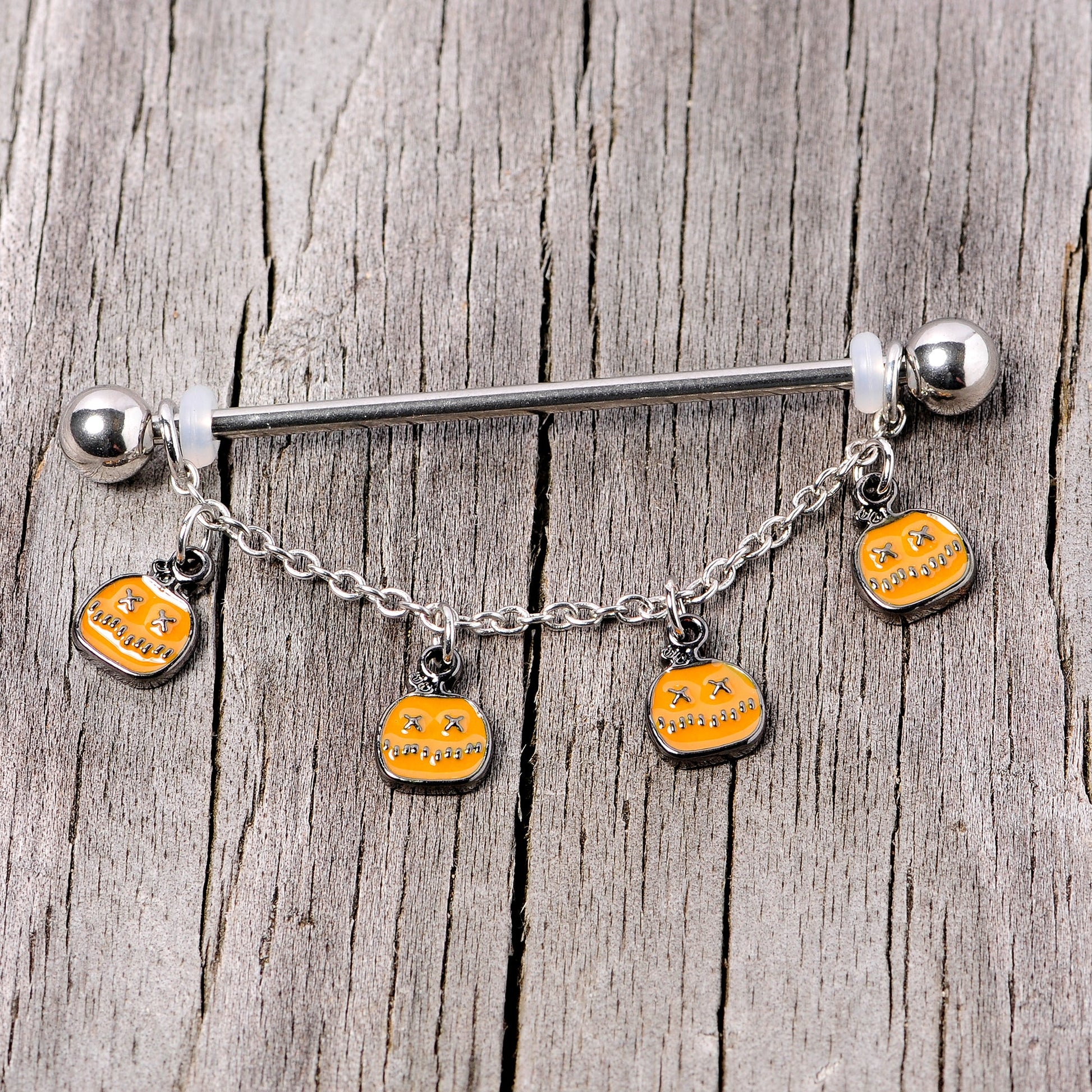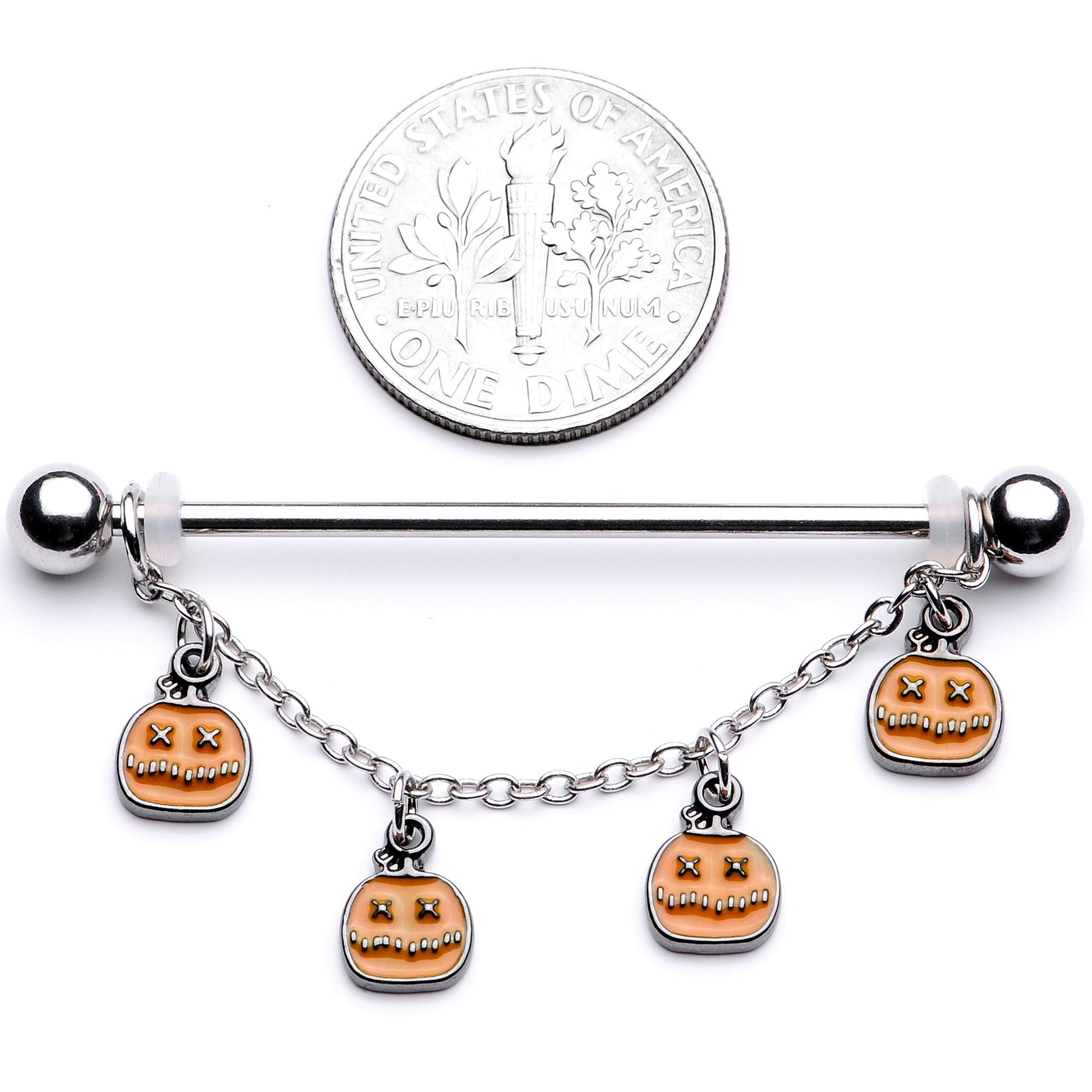 If you are a regular scream queen then get ready for Halloween this year with the perfect 14 gauge industrial piercing. Made with a 1 1/2" durable 316L surgical grade stainless steel straight barbell, this industrial earring features 5mm ball ends and an adjustable chain dangle that features a series of orange jack 'o lantern dangle charms. This industrial body jewelry is super scary!Specifications