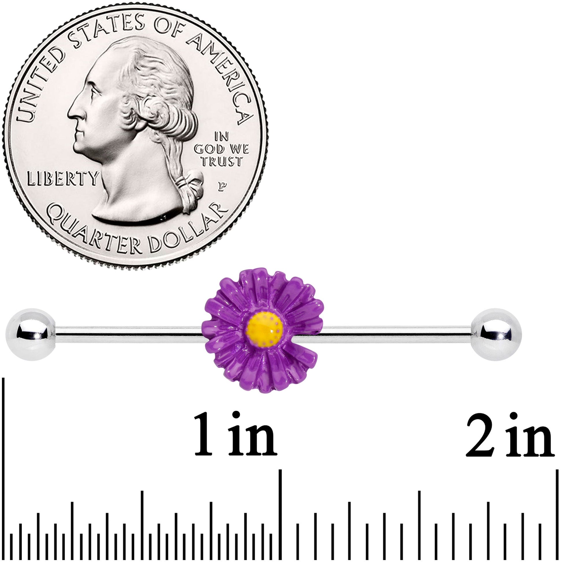 Let the daisy on this 14 gauge helix barbell bedeck your piercing in colorful style! It's made with a 1 1/2" durable 316L surgical grade stainless steel straight barbell with 5mm ball ends. It features a three-dimensional purple and yellow daisy charm. And you can slide the daisy up and down the length of the barbell to get exactly the look you want. Your industrial piercing will blossom with this delicious daisy in it!Specifications