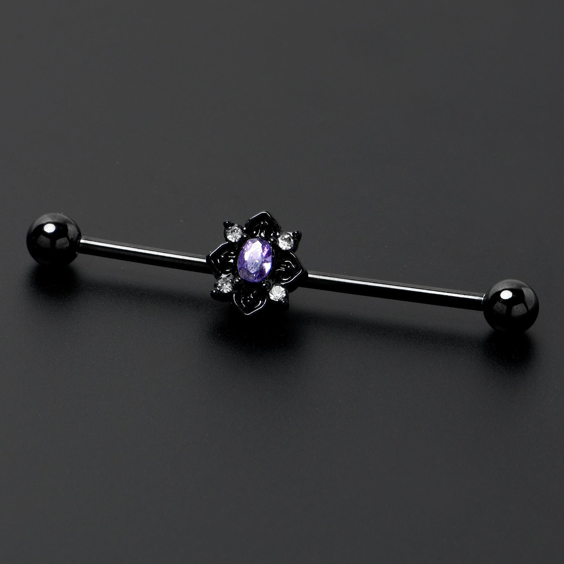 Fall in love with a goth new look, like on this 14 gauge helix barbell. It is made with a 1 1/2 inch black PVD over 316L surgical grade stainless steel straight barbell with 5mm ball ends. It features an oval charm, with a purple gem center. It is further embellished with scrollwork hearts, with a clear gem set between each one. You can even slide it up and down the length of the barbell for the perfect look. Let your inner goth come out to play with this darkly divine barbell earring.Specifications