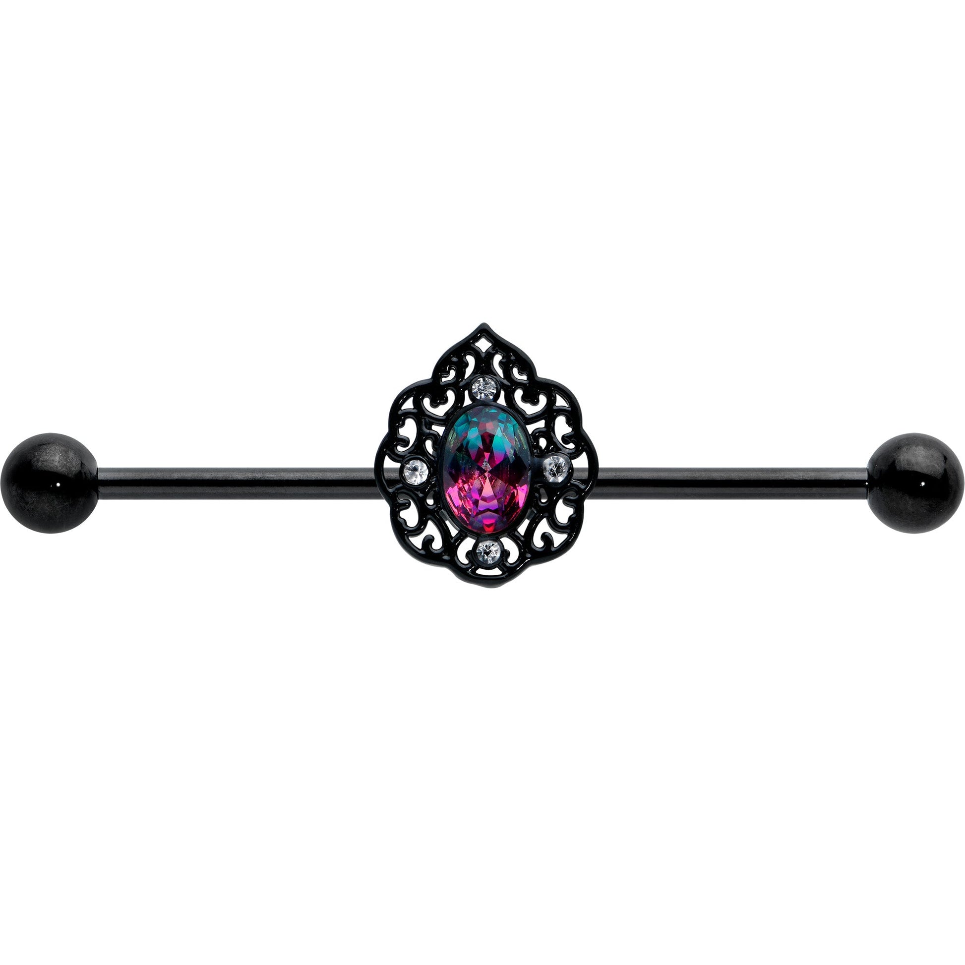 This 14 gauge helix full of fairy tale elegance. It's made with a 1 1/2" black PVD over 316L surgical grade stainless steel straight barbell with 5mm ball ends. It features a scalloped, oval charm. The charm is set at the center with a purple tourmaline that shifts to blue for a look that is truly magical. It's further embellished with a filigree detailing and clear gems, and you can you can even slide the charm up and down the barbell for the perfect look. You can't help but feel the magic when you're wearing this fairy tale-worthy barbell earring!Specifications