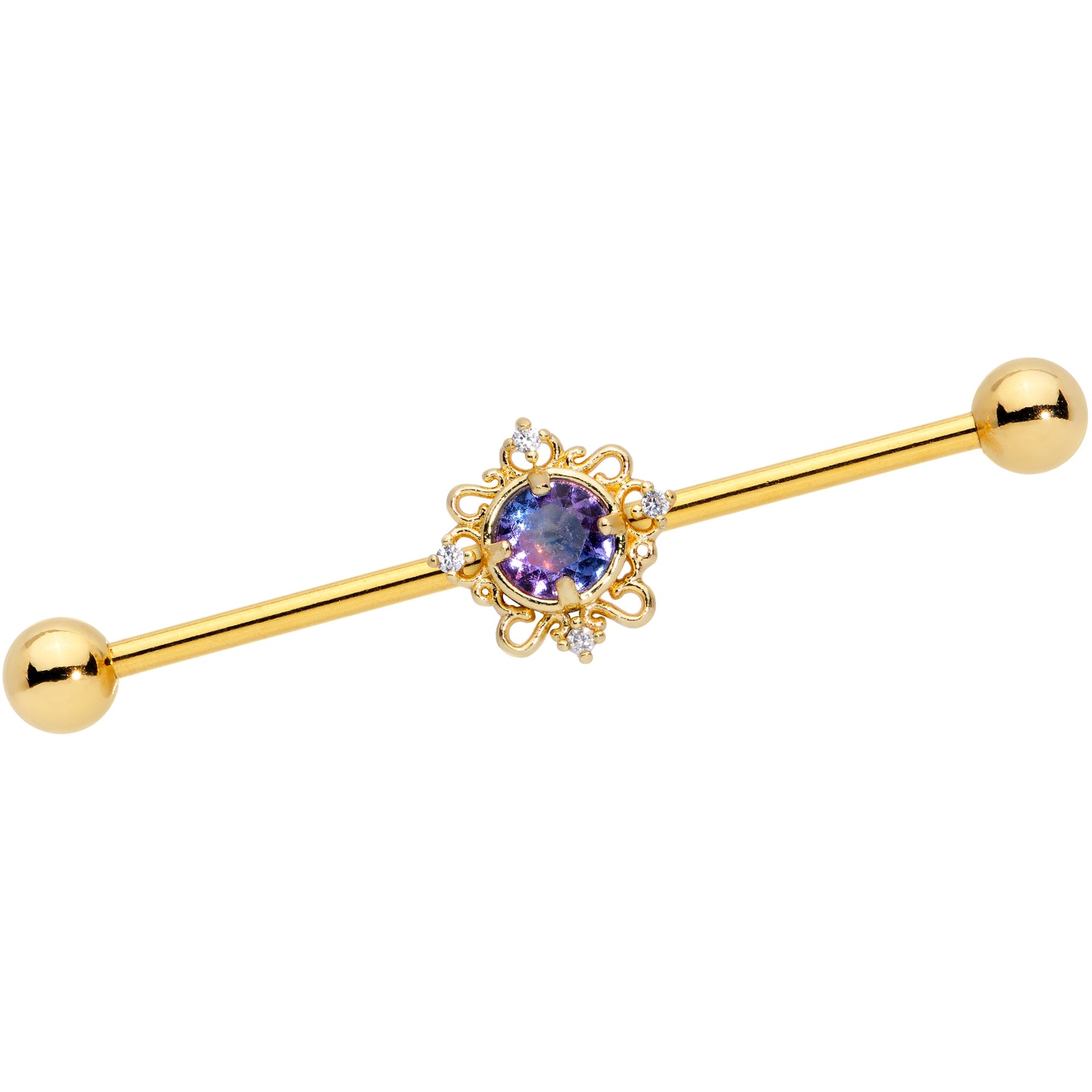 14 Gauge Purple Tourmaline Gold Tone Filigree Industrial Barbell 38mm
