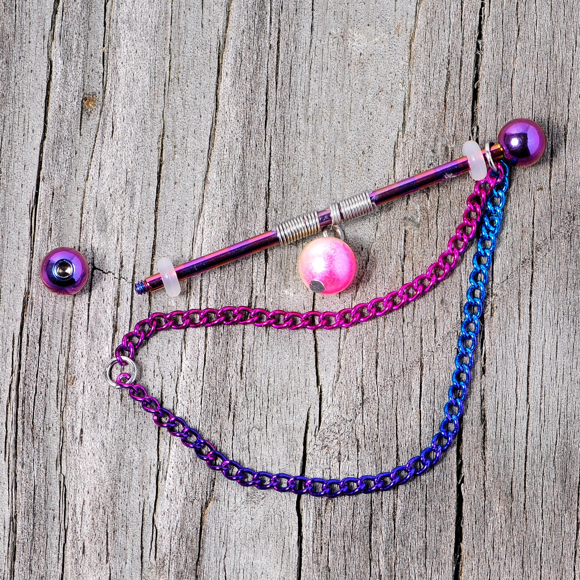 Why put a little color in your industrial piercing when you can put all the colors in your industrial piercing? This 14 gauge helix barbell is made with a 1 1/2" rainbow plated over 316L surgical grade stainless steel straight barbell with 5mm ball ends. It features a double length of dangling chain in matching rainbow tones. It also has a pearlescent orb dangling from the center of the barbell that melds yellow and hot pink to let it match the overall color scheme without simply getting lost in it. Best of all, you can move the ends of the chains back and forth along the barbell to get just the look you're after. Let this colorful barbell earring add some drama to your helix piercings!Specifications