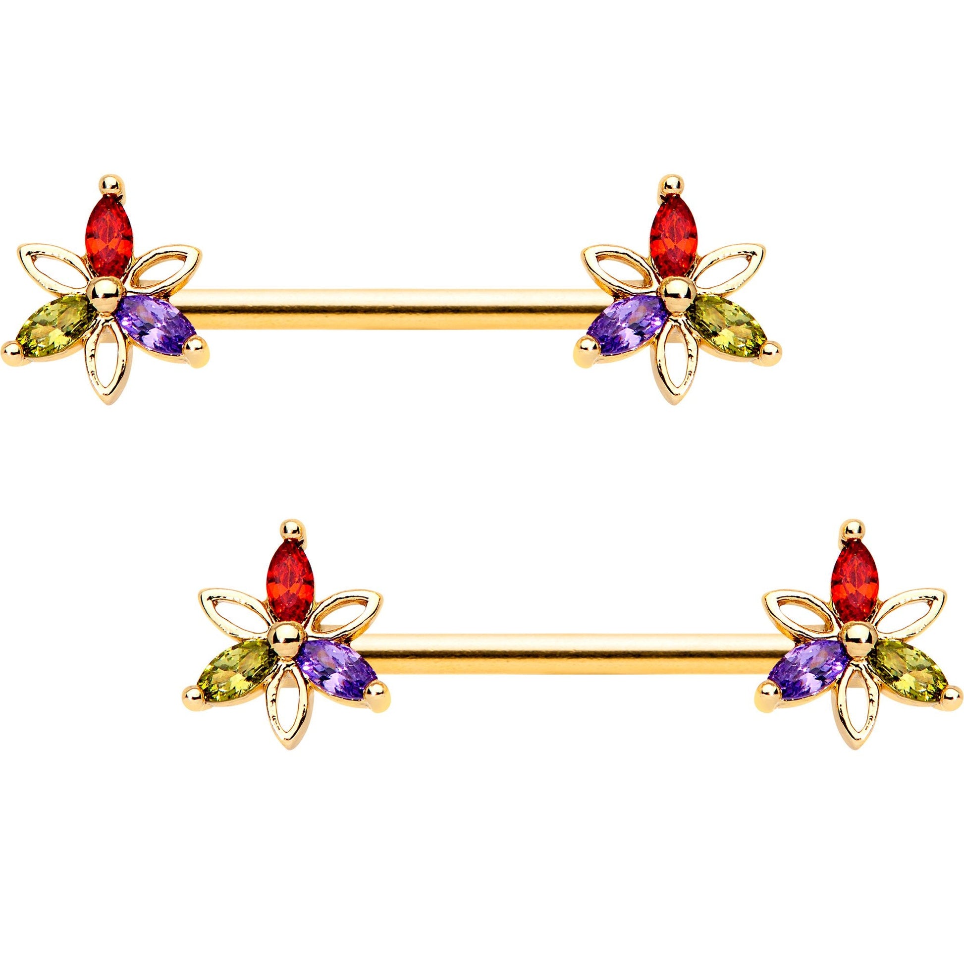 14G Rainbow Gem Star Gold Tone BCR Ring Barbell Nipple Ring Set