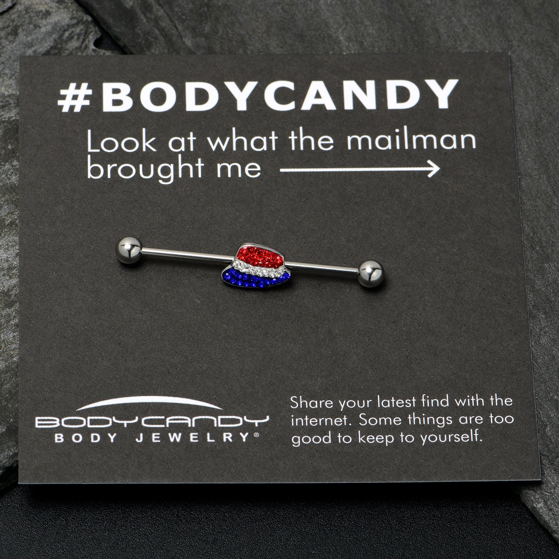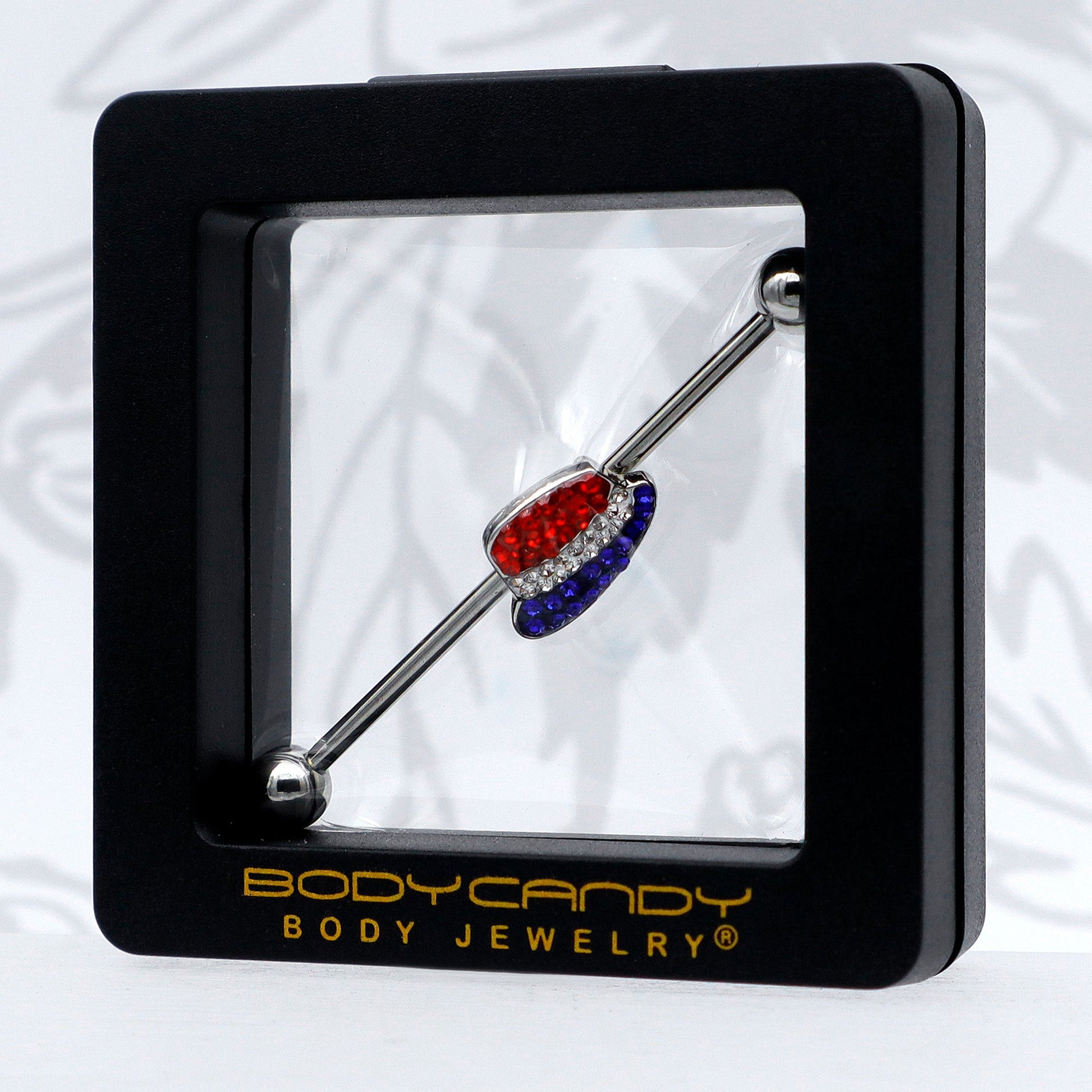 Uncle Sam is sure to covet this festive and glamorous 14 gauge helix barbell. It is made with a 1 1/2 inch 316L surgical grade stainless steel straight barbell with 5mm ball ends. It features a hat charm, paved in patriotic red, white, and blue gems and you can even slide the charm up and down the length of the barbell for the perfect look. Get ready to rock this Independence Day in style with this perfectly patriotic barbell earring.Specifications