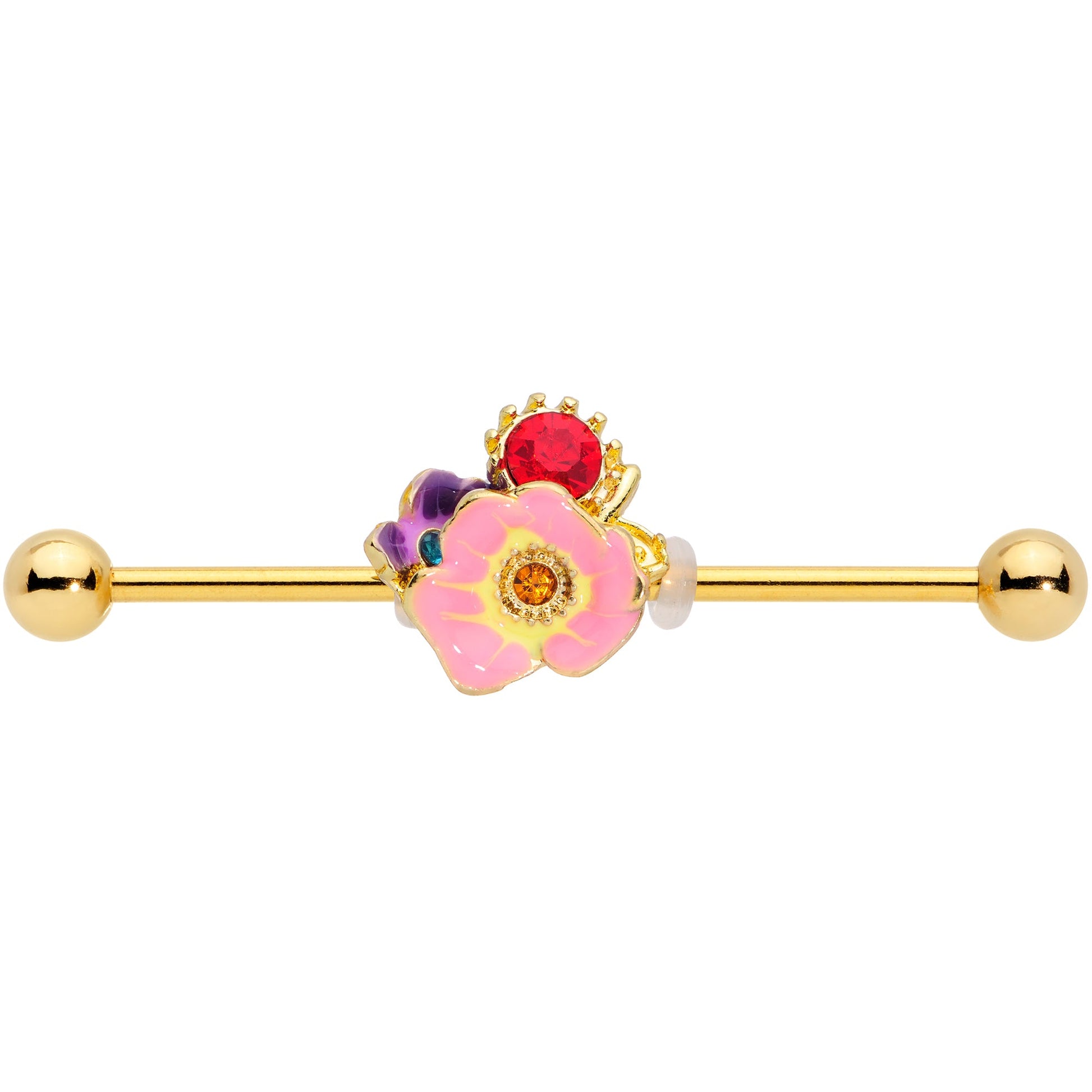 The flowers on this 14 gauge helix barbell have burst into beautiful bloom! It's made with a 1 1/2" gold tone PVD over 316L surgical grade stainless steel straight barbell with 5mm ball ends. It features a large floral charm centered around a pink flower with a yellow gem center. Beneath the flower is a large red gem on the left side. On the right is a purple flower with a striking blue gem center. You can even slide the charm up and down the length of the barbell to get just the look you're after! Give your industrial piercing a touch of floral fantasy with this blooming beautiful barbell earring.Specifications