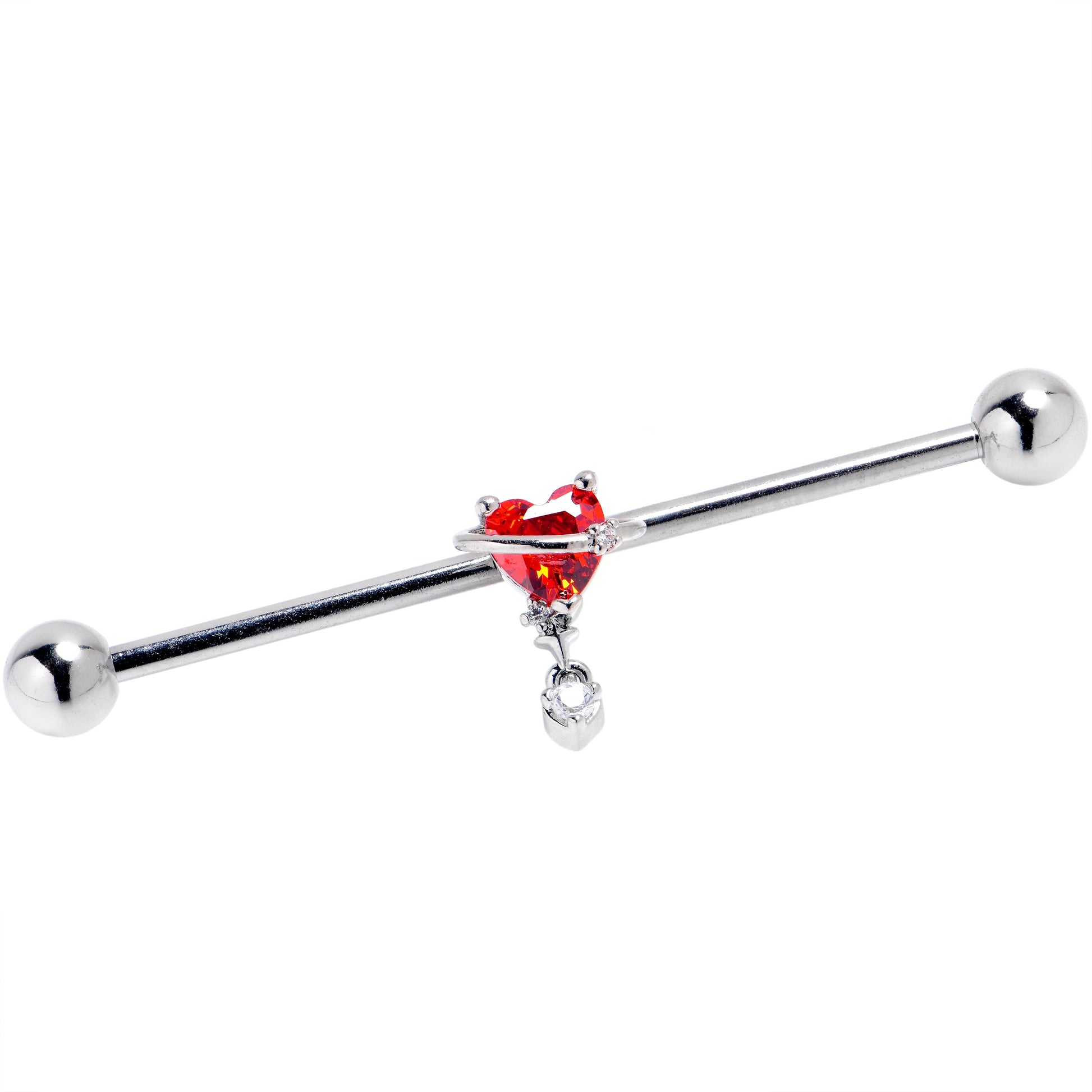 14 Gauge Red Clear Gem Saturn Heart Dangle Industrial Barbell 38mm