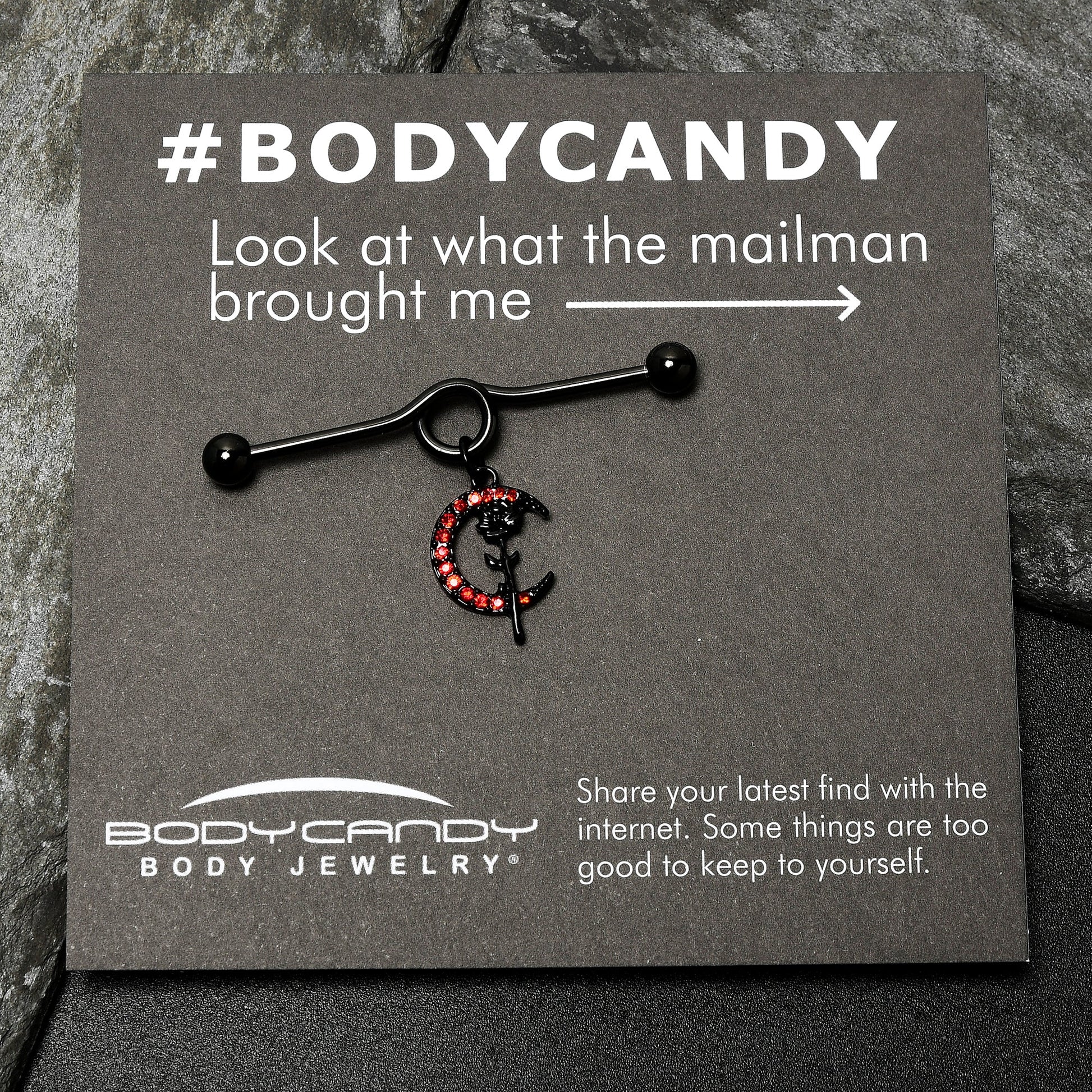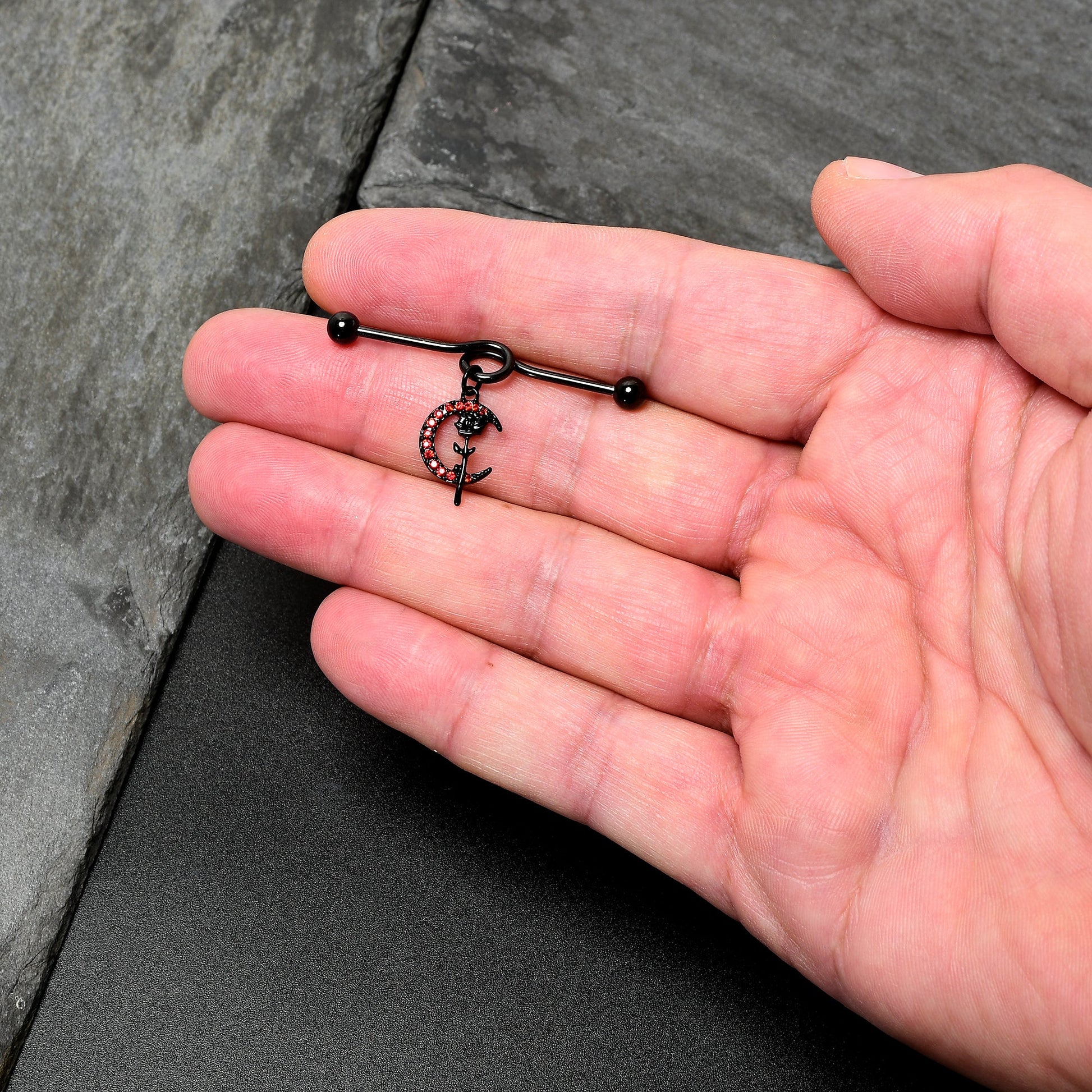What could be more romantic than flowers and moonlight....like on this 14 gauge helix barbell? It's made with a 1 1/2" black PVD over 316L surgical grade stainless steel project bar with 5mm ball ends. It features a loop in the center that supports a dangling crescent moon charm. The moon is paved in red cubic zirconia gems and is crossed with a black rose detail that adds a truly eye-catching touch of romance. You'll totally fall in love with this classically gothic barbell earring.Specifications
