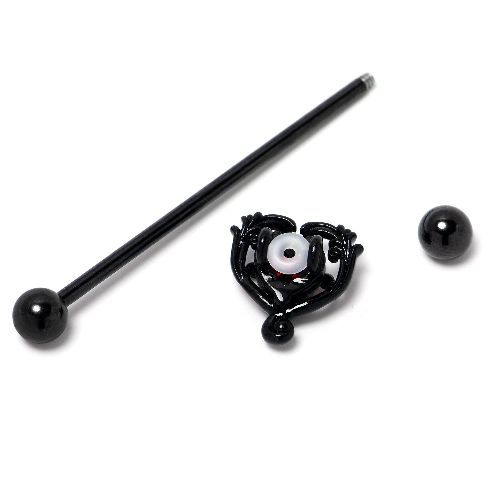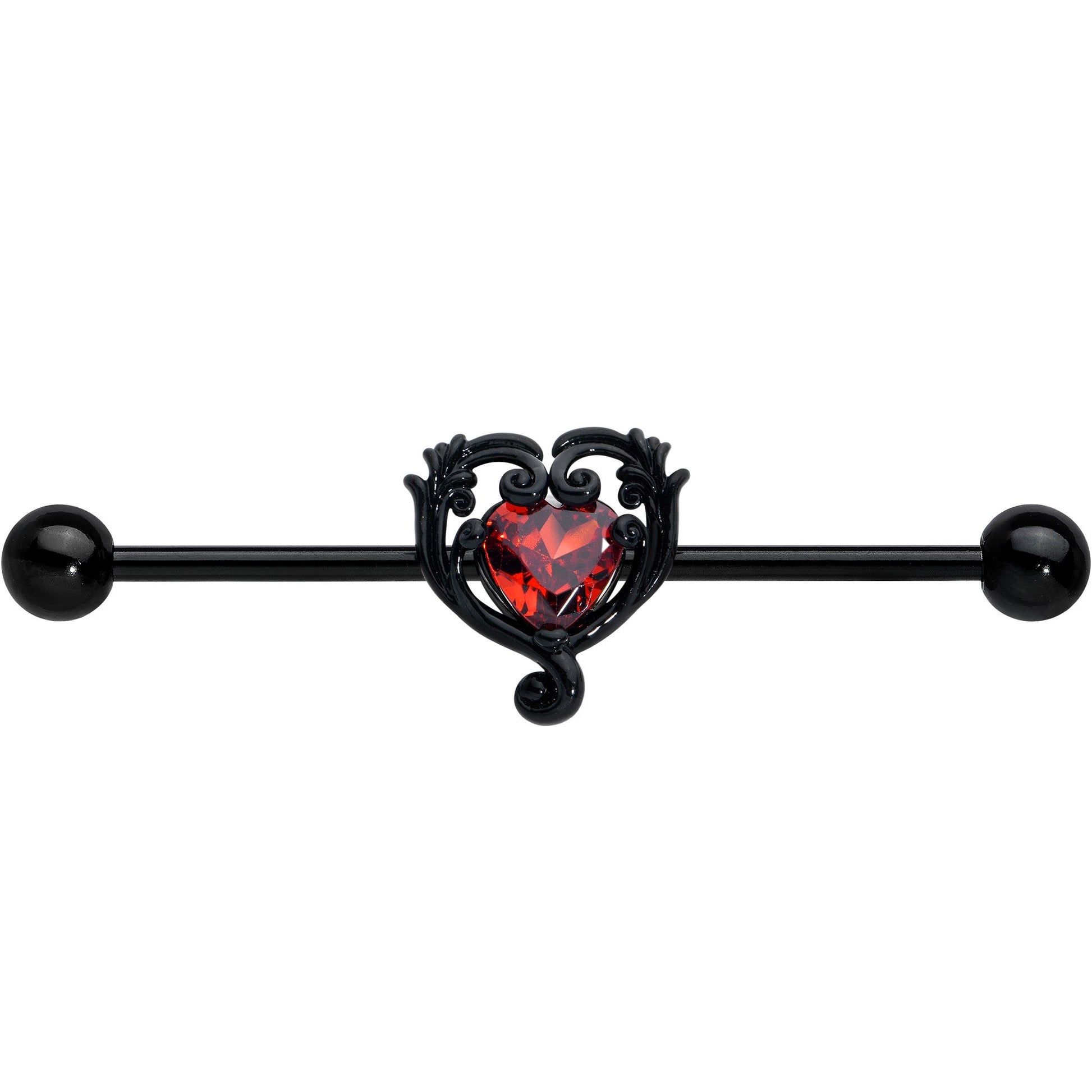 Get an antique inspired look that will steal your heart with this 14 gauge helix barbell. It is made with a 1 1/2 inch black PVD over 316L surgical grade stainless steel straight barbell with 5mm ball ends. It features a double heart charm, with the outer heart twining to give it a look that is both timeless and elegant while the inner heart is composed entirely of a single red cubic zirconia gem. You can even slide it up and down the length of the barbell for the perfect look. Wear your heart on your sleeve and in your piercings with this gothic barbell earring.Specifications