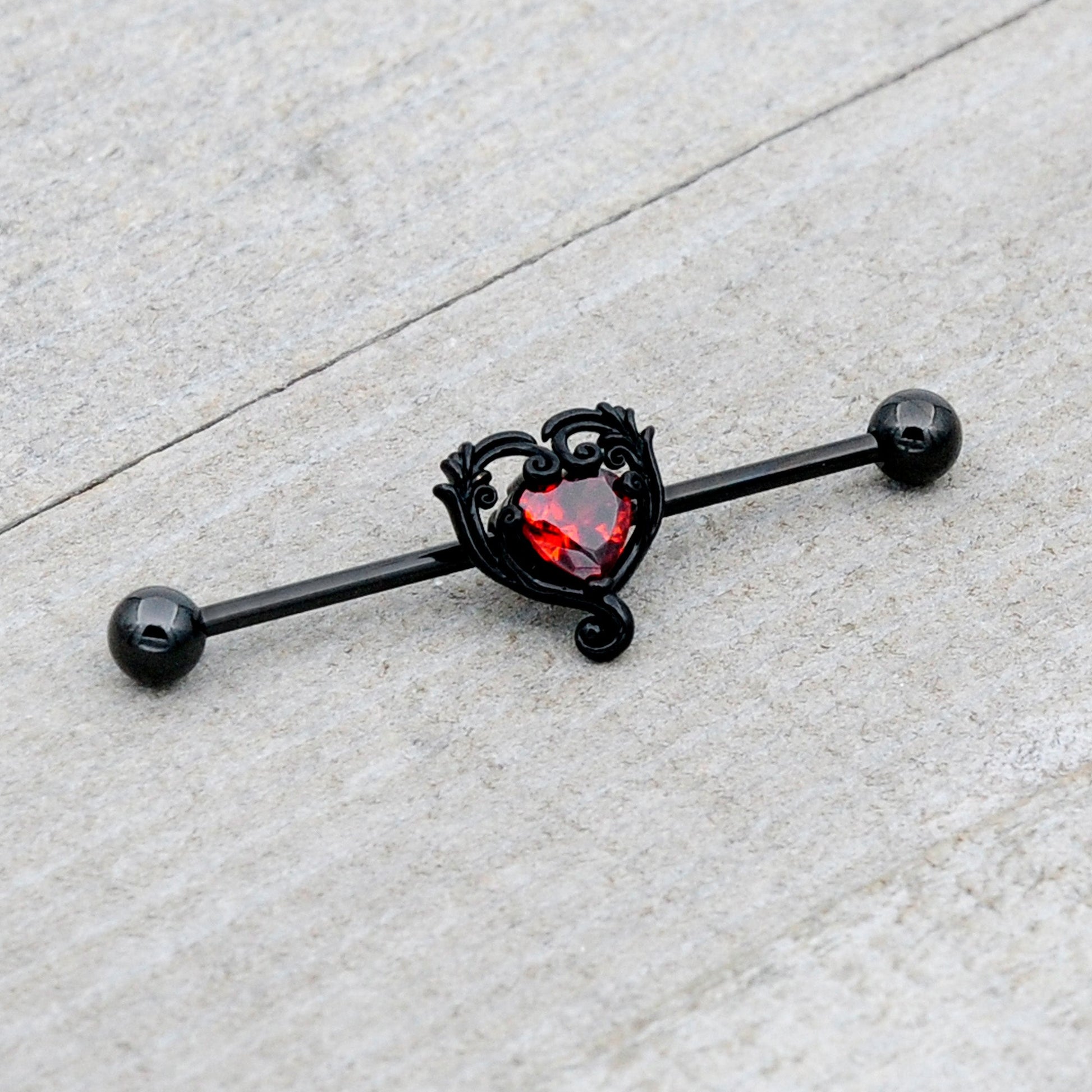 14 Gauge Red CZ Gem Black Passion Heart Industrial Barbell 38mm