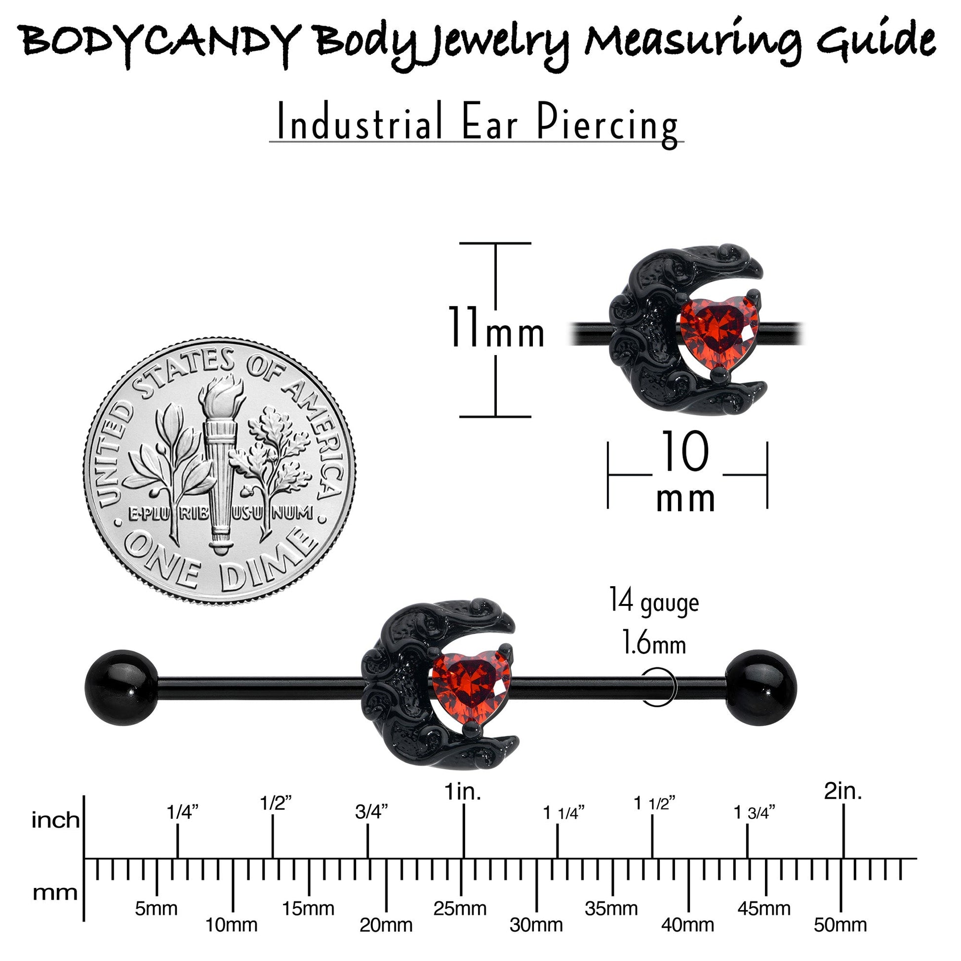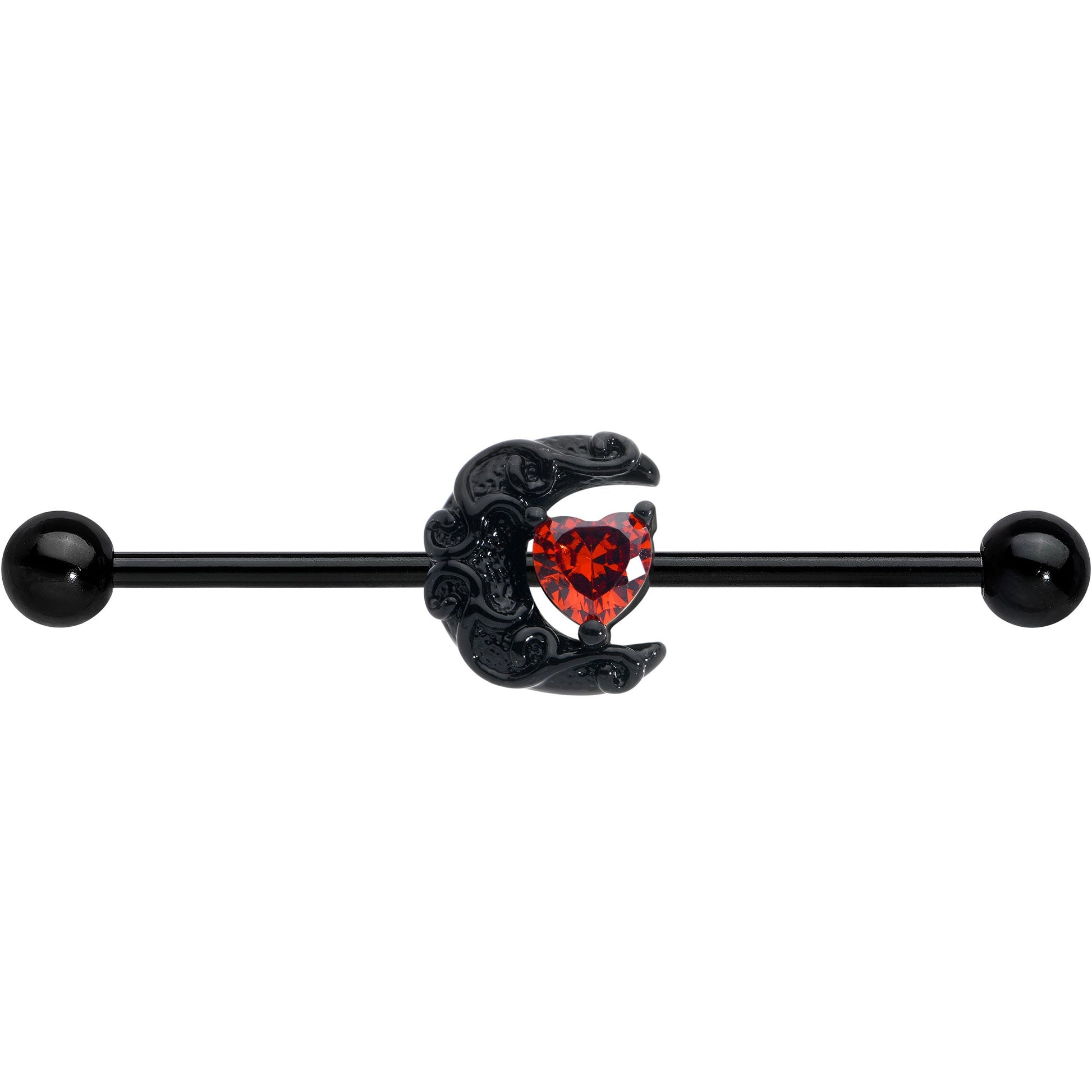 14 Gauge Red CZ Gem Black Scroll Moon Heart Industrial Barbell 38mm