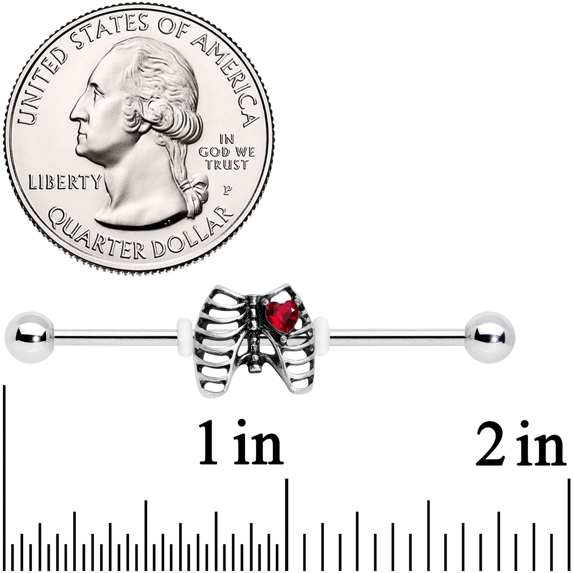 Whether you're smitten with skeletons or hungry for love, this 14 gauge helix barbell is sure to say it all! It's made with a 1 1/2" durable 316L surgical grade stainless steel straight barbell with 5mm ball ends. It features a rib cage charm, with each rib carefully detailed. The rib cage is set with a red cubic zirconia gem heart, adding extra color and style. You can also slide it up and down the length of the barbell to get the perfect look. Perfect for Halloween, this barbell earring will have you loving your industrial piercing all year round!Specifications