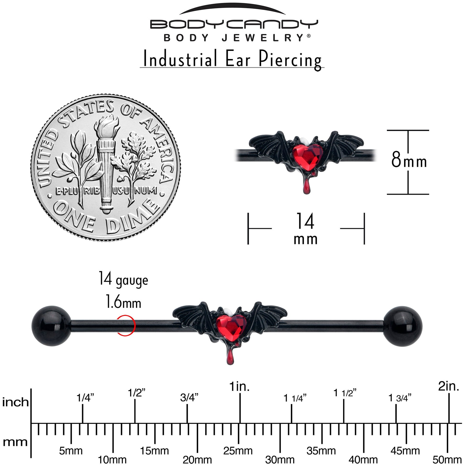 Love the night til it hurts with this 14 gauge helix barbell. It's made with a 1 1/2 inch black plated over 316L surgical grade stainless steel straight barbell with 5mm ball ends. It features a red gem heart embellished with black bat wings. It is further embellished with red drip marks to make the heart look like it's bleeding. You can even slide it up and down the length of the barbell for the perfect look. You'll love this batty barbell earring to death.Specifications