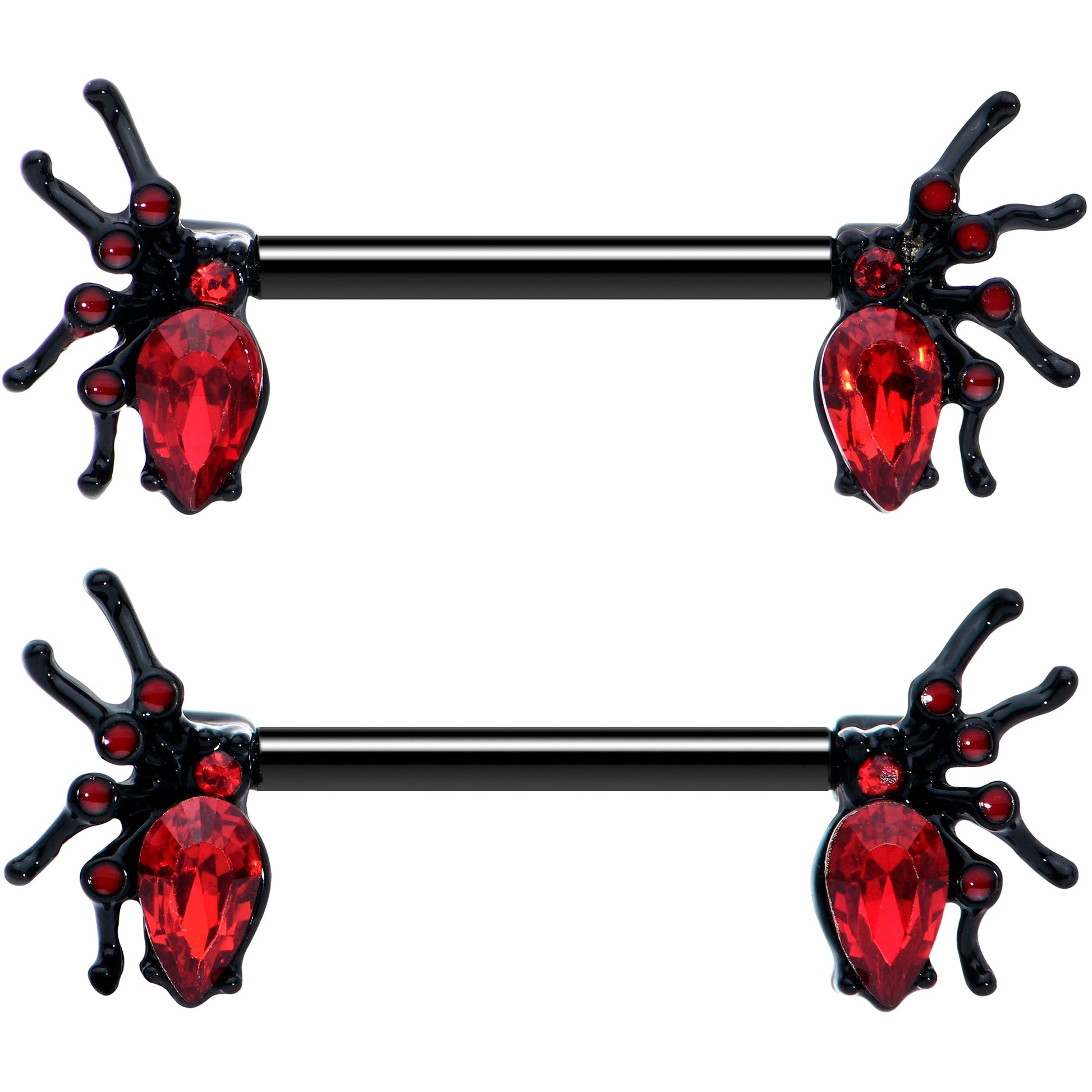 These stunning little spiders can't wait to crawl into your nipple piercings and hang out for Halloween! This 14 gauge nipple jewelry is made with 14mm black PVD over 316L surgical grade stainless steel straight barbells. Each of the ends features a striking spider charm with the body composed of red gems. It even has carefully articulated legs, embellished with more red gems, for a look that's realistic as well stylish! This Halloween, let these spiders catch your nipple piercings in a web of beauty! Sold as a set of two.Specifications