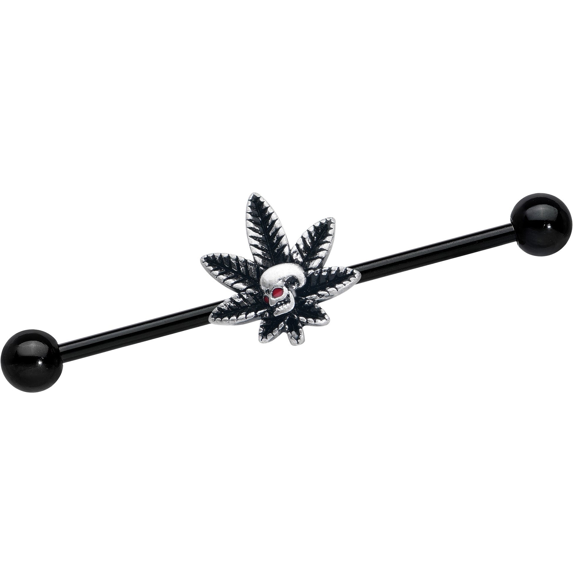 You may puff, puff, pass, but you will not want to pass on this 14 gauge helix barbell. It is made with a 1 1/2 inch black PVD over 316L surgical grade stainless steel straight barbell with 5mm ball ends. It features a skull charm, with red gem eyes for a look that is super metal. It is sitting on a pot leaf charm for maximum impact and you can slide the charm up and down the length of the barbell for the perfect look. You will be high, happy, and totally hardcore if you smoke and rock out with this weed leaf and skull barbell earring.Specifications