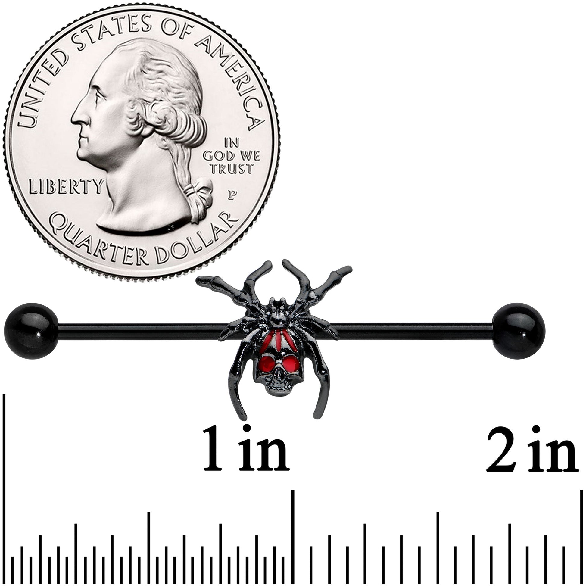 Cast your web...you'll knock 'em dead with this 14 gauge helix barbell! It's made with a 1 1/2" black PVD over 316L surgical grade stainless steel straight barbell with 5mm ball ends. It features a spider charm in matching black. The spider features red gems set into its back, resembling the infamous black widow spider! With her individually articulated legs, this creepy-crawly looks both realistic and really amazing and you can slide her up and down the barbell to get the look you want. Whether you want to spice up your look for Halloween or find arachnids amazing, this barbell earring is sure to snare you in a web of style!Specifications