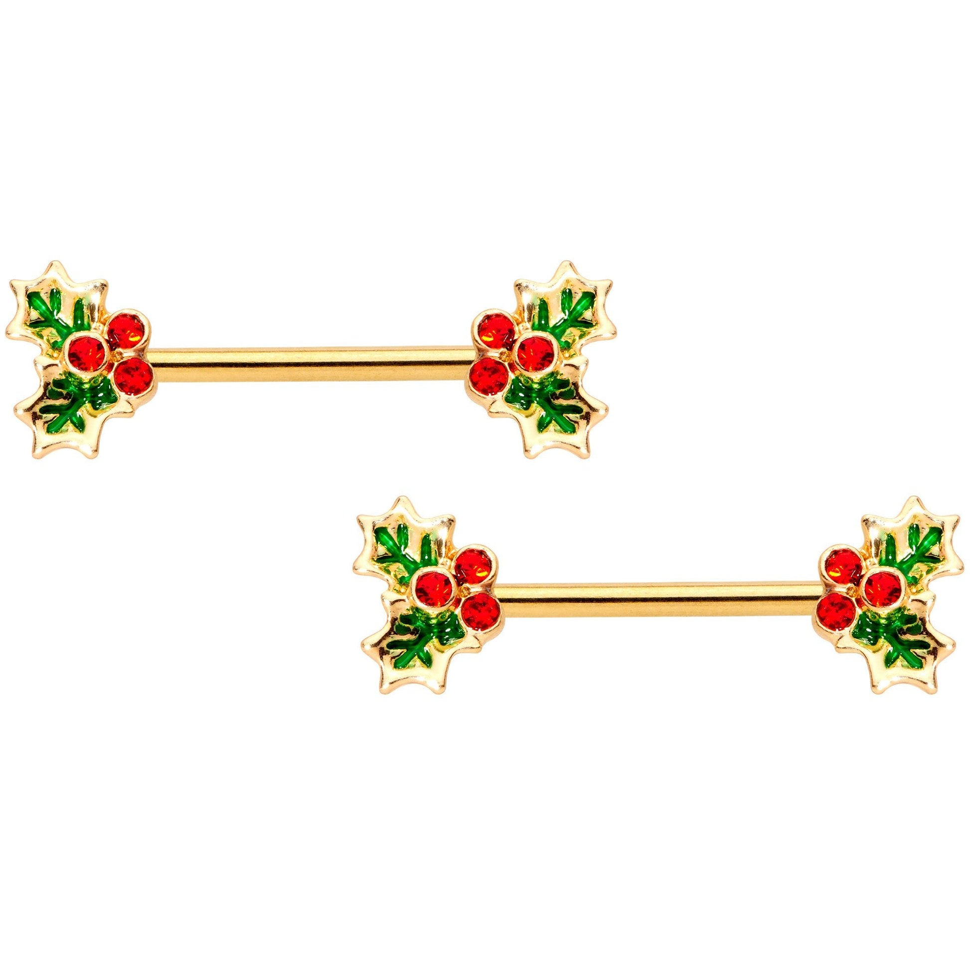 This 14 gauge set of nipple jewelry gives you options so you can mix it up for the holiday season! The 9/16" gold tone plated over 316L surgical grade stainless steel straight barbells are tipped with mistletoe end for those festive occasions. Inlaid with green and set with red gem "berries", they let you combine cute with comfortable for some hidden holiday spirit. Also included are a pair of 8mm gold tone plated over 316L surgical grade stainless steel captive rings for simple style to match your flashiest holiday finery. No matter what look you're going for with your piercings, this set has got you covered! Sold as a set of four.Specifications
