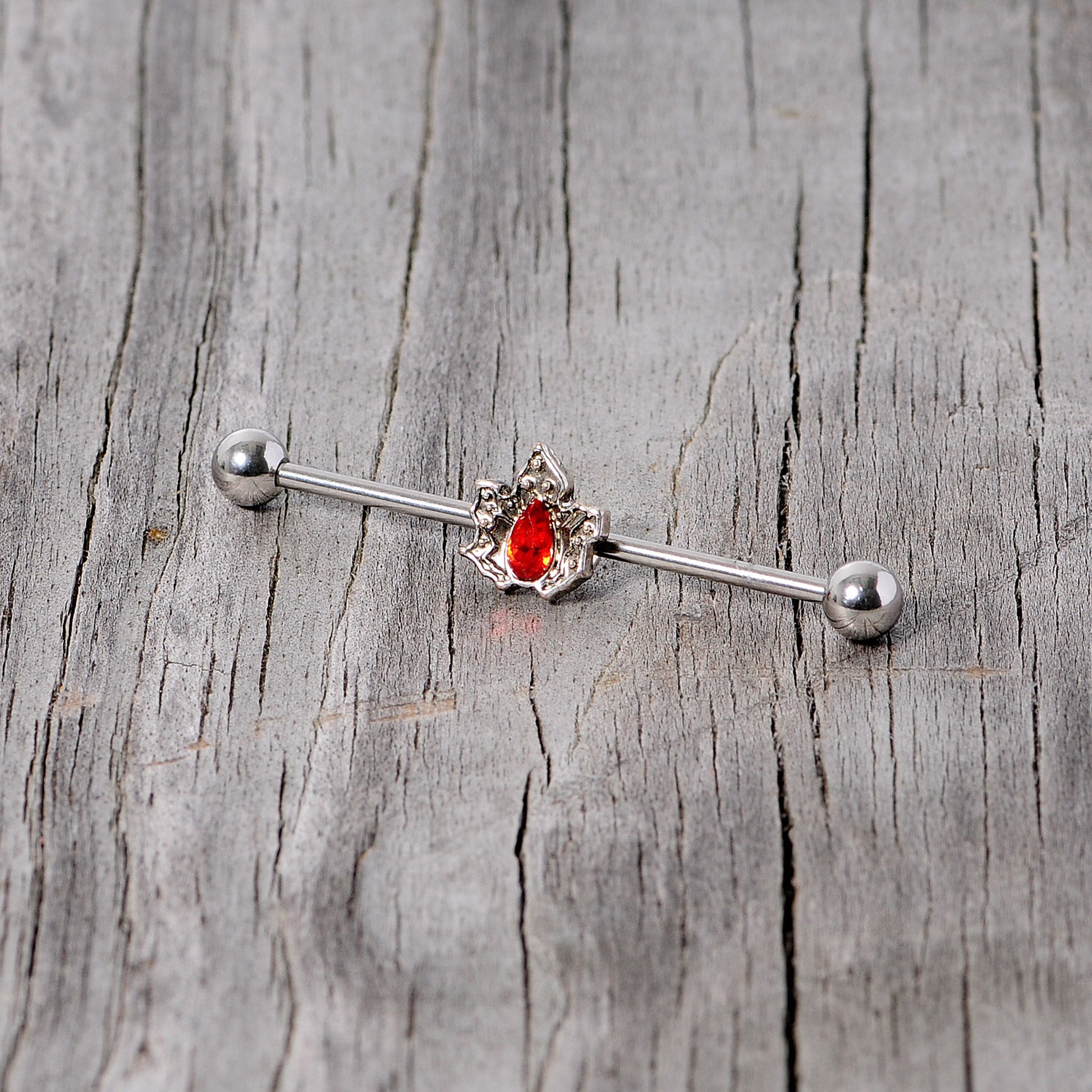 Put some holly in your holiday season with this 14 gauge helix barbell! It's made with a 1 1/2" durable 316L surgical grade stainless steel straight barbell with 5mm ball ends. It features a holly leaf charm with a large red gem for a luscious pop of holiday color. And you can slide it up and down the length of the barbell industrial to get just the look you're after. You're sure to have a happy Christmas when you're wearing something this beautiful!Specifications