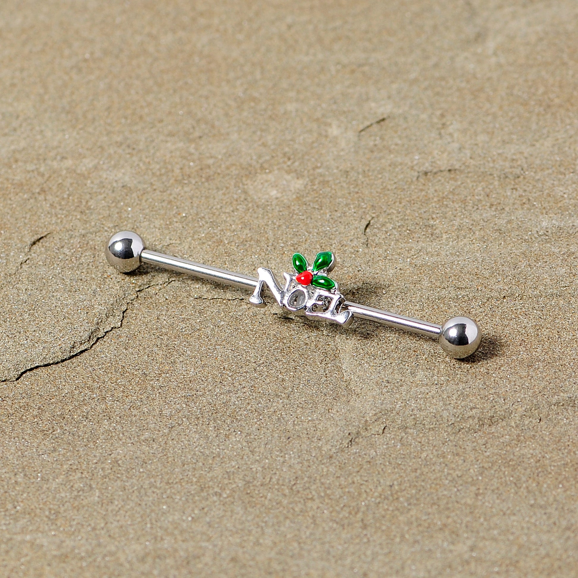 Make your holidays a little more happy with this 14 gauge industrial jewelry! It's made with a 1 1/2" durable 316L surgical grade stainless steel straight barbell and features a moveable "Noel" charm topped green holly leaves and a single red holly berry. If you can't wait to have a happy holiday this Christmas Eve then get this industrial earring into your piercing now!Specifications