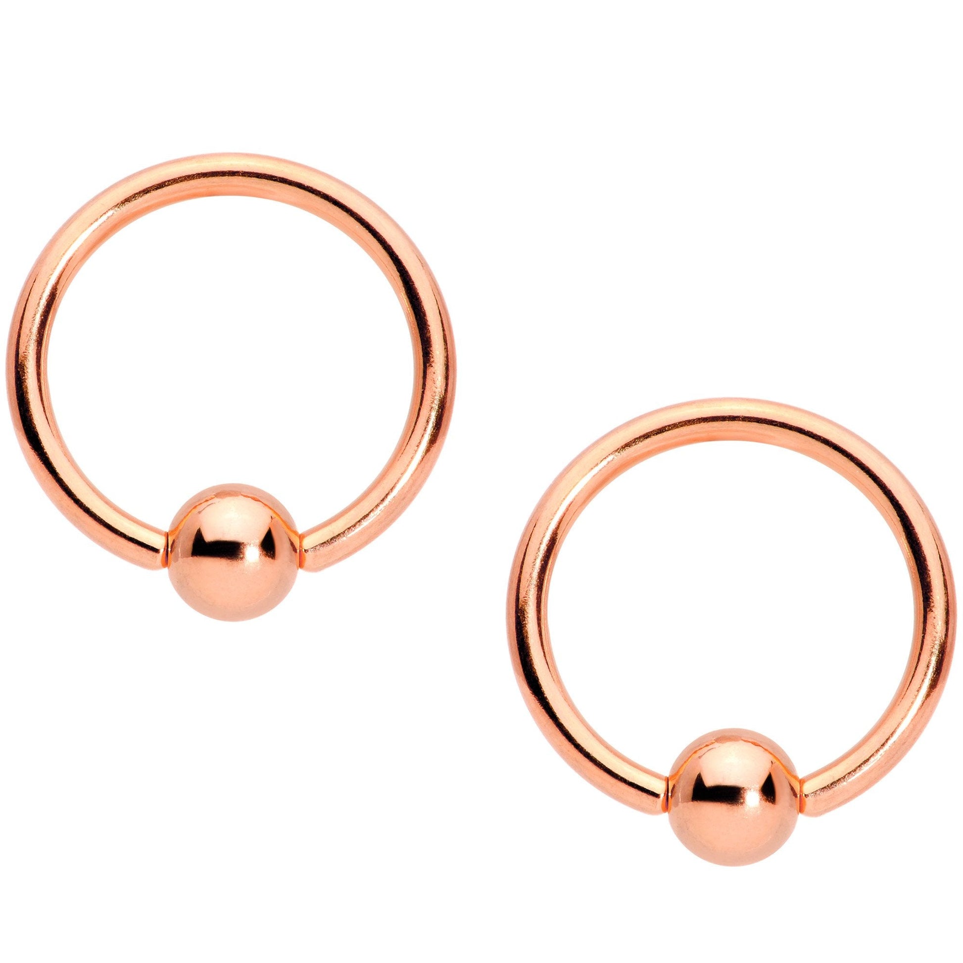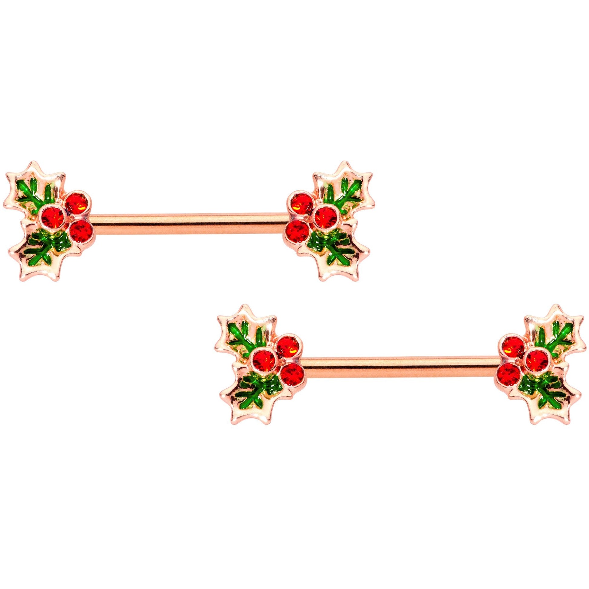 This 14 gauge set of nipple jewelry gives you options so you can mix it up for the holiday season! The 9/16" rose gold tone plated over 316L surgical grade stainless steel straight barbells are tipped with mistletoe end for those festive occasions. Inlaid with green and set with red gem "berries", they let you combine cute with comfortable for some hidden holiday spirit. Also included are a pair of 8mm rose gold tone plated over 316L surgical grade stainless steel captive rings for simple style to match your flashiest holiday finery. No matter what look you're going for with your piercings, this set has got you covered! Sold as a set of four.Specifications