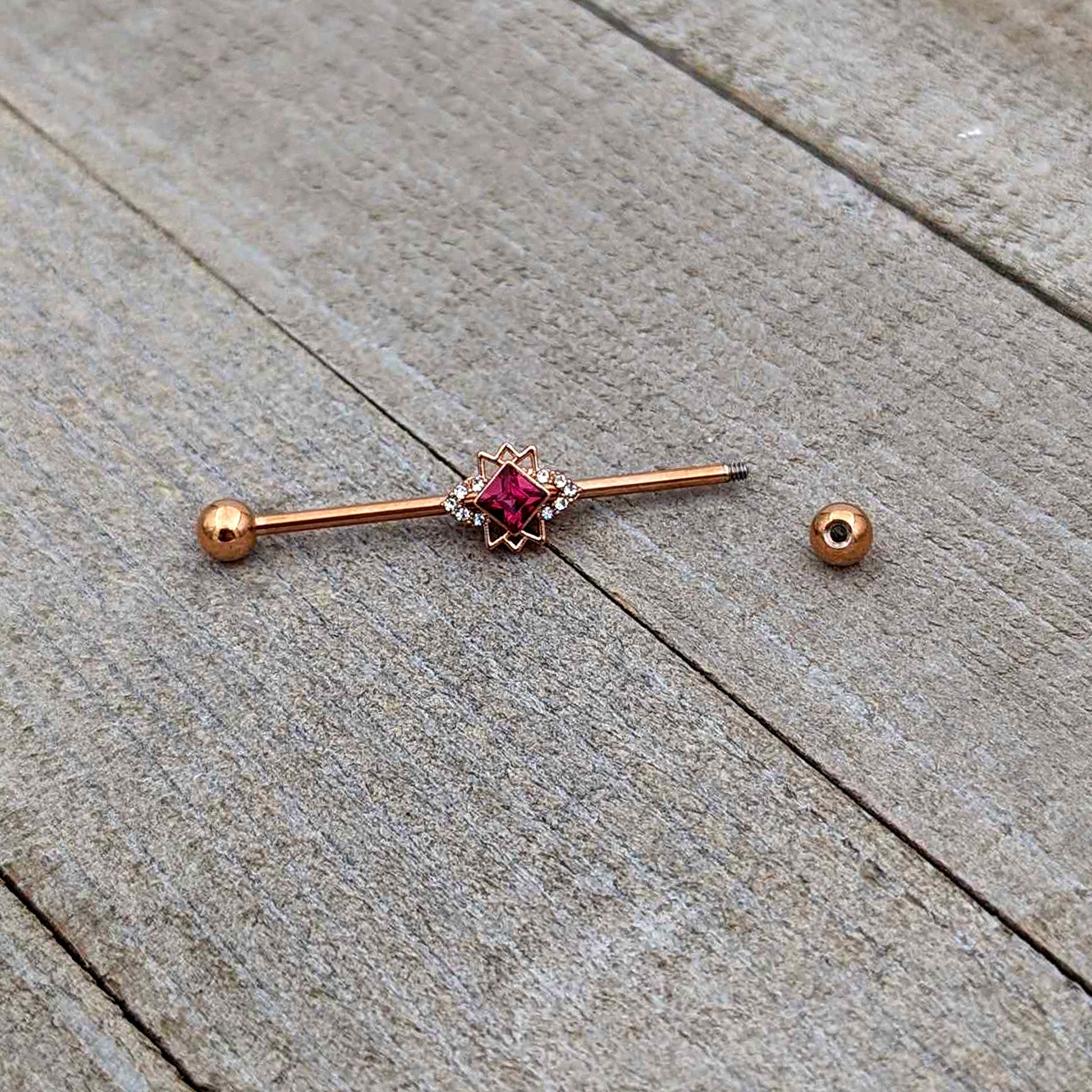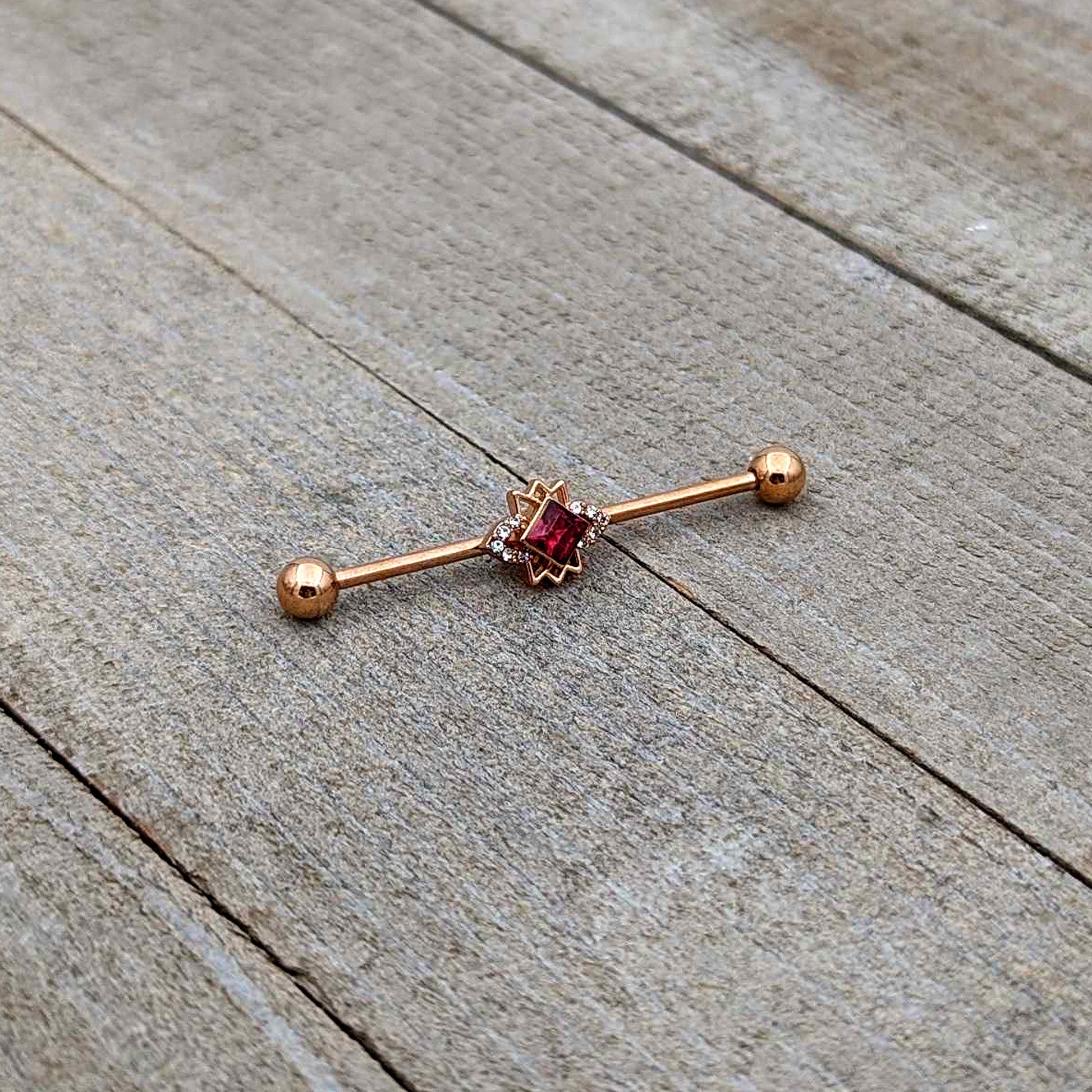 14 Gauge Red Gem Rose Gold Tone Octogram Star Industrial Barbell 38mm