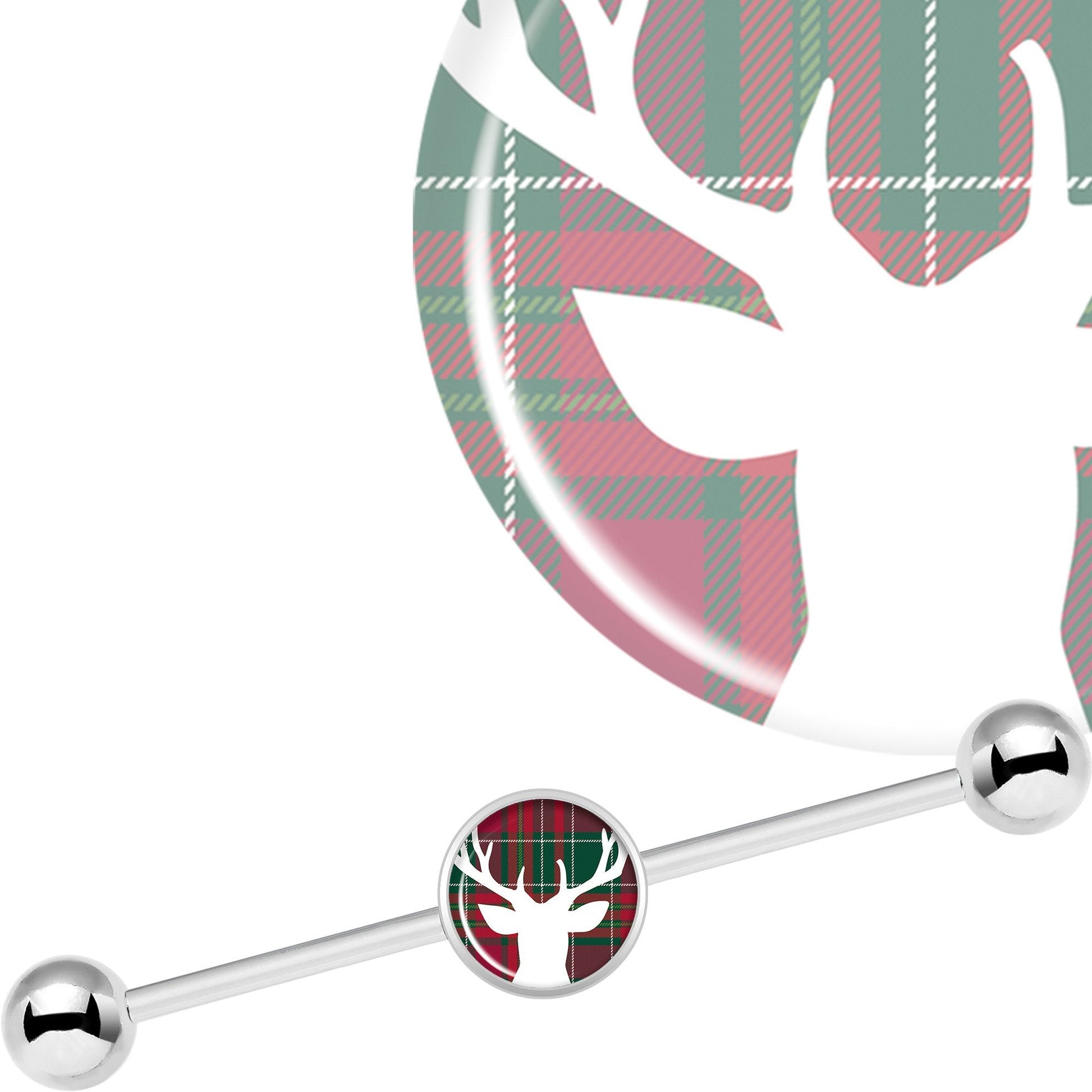 Get decked out from head to toe in Christmas spirit when you wear this festive 14 gauge holiday industrial piercing! Made with a 1.45" durable 316L surgical grade stainless steel straight barbell, this holiday industrial earring features a reindeer silhouette over a red and green plaid background nonmoving logo inlay charm. This plaid reindeer holiday barbell earring makes a perfect seasonal gift for someone special to you.