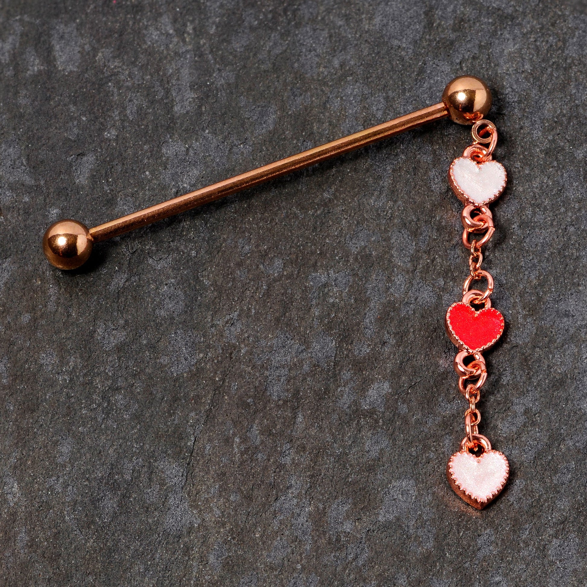 This 14 gauge helix barbell is sure to make your heart beat faster! It's made with a 1 1/2" rose gold tone plated over 316L surgical grade stainless steel straight barbell with 5mm ball ends. Dangling from one ball end is a length of chain that supports three red and white heart dangle charms. Be the queen with all the hearts with this Valentine's Day-themed industrial earring!Specifications