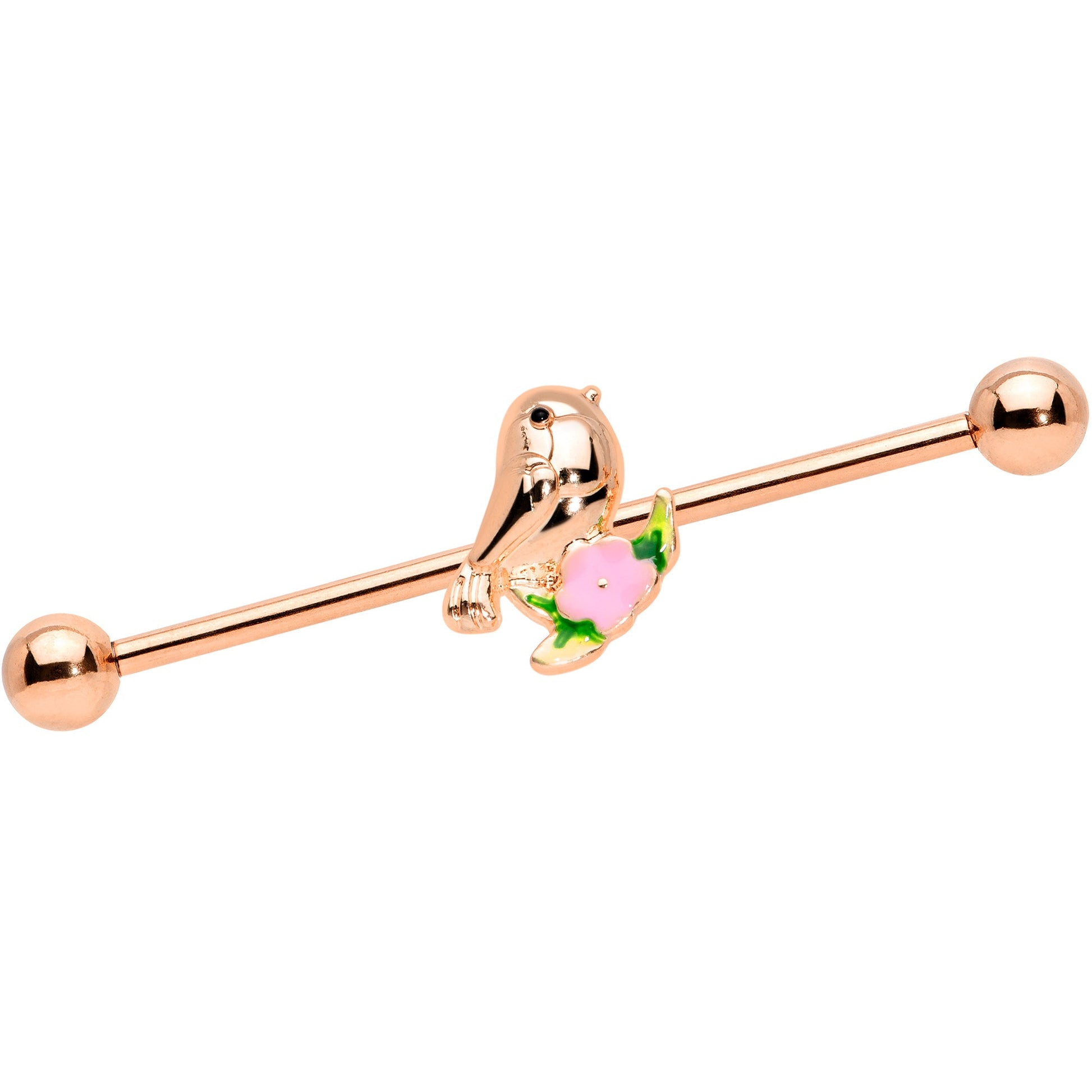 14 Gauge Rose Gold Tone Bird Pink Flower Industrial Barbell 38mm