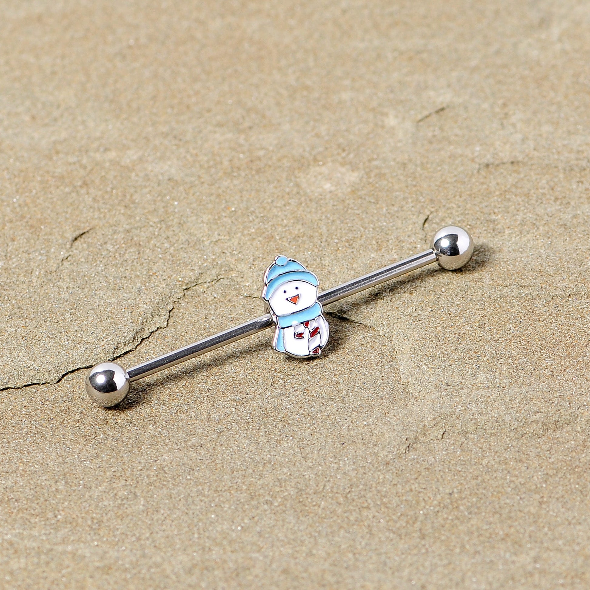 If you can't wait to walk around in a winter wonderland this Christmas season then you will love this 14 gauge industrial earring because it is so cool! Made with a 1 1/2" durable 316L surgical grade stainless steel straight barbell, this barbell industrial features a moveable snowman charm with a blue cap and scarf, and a candy cane too! Happy holidays to you!Specifications