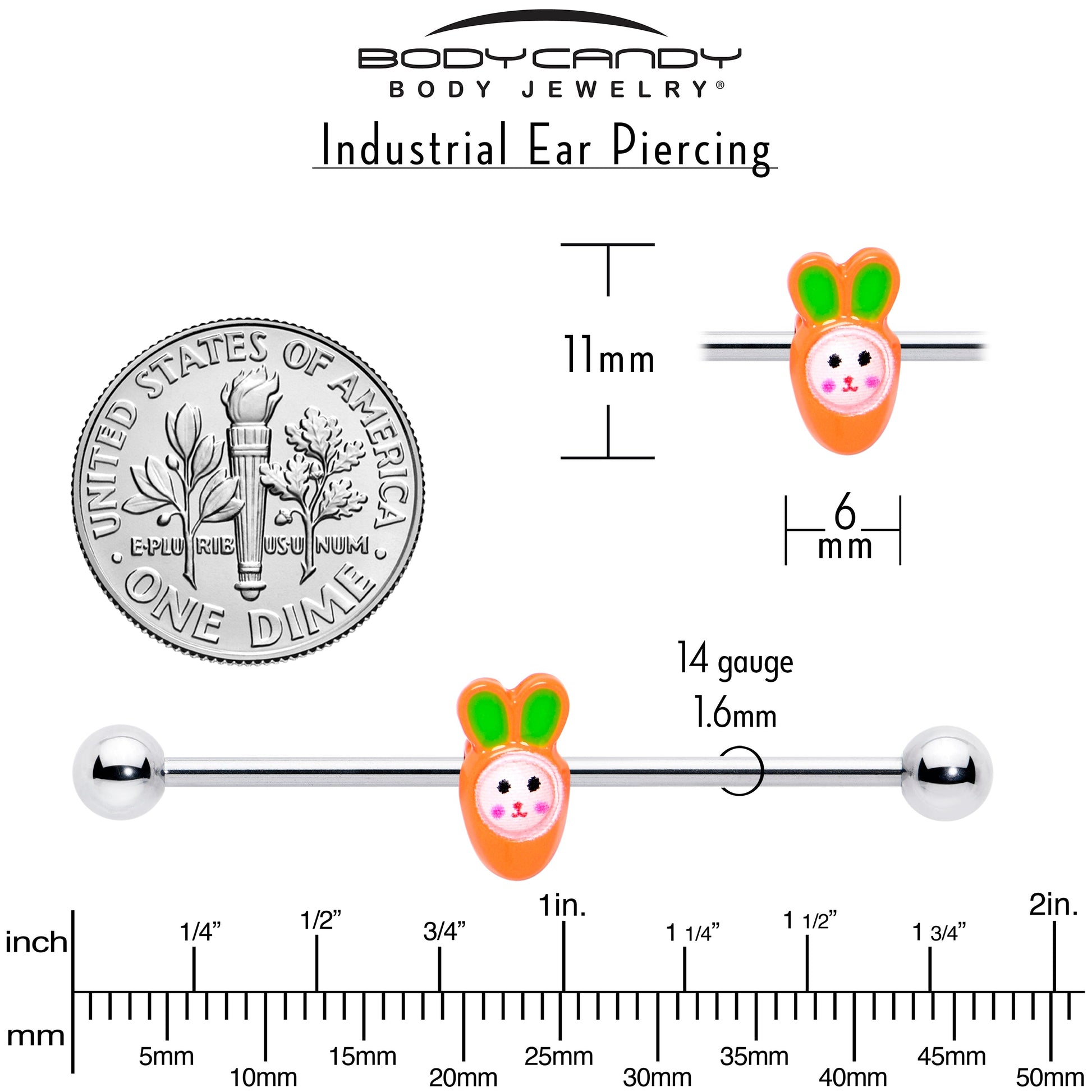 Get something even sweeter than chocolate in your Easter egg with this 14 gauge helix barbell. It's made with a 1 1/2 inch 316L surgical grade stainless steel straight barbell with 5mm ball ends. It features an orange carrot charm. The carrot features a bunny face peeking out, with green detailing on the ears for a leafy look that you can even slide up and down the length of the barbell for the perfect look. Let your piercings play peek-a-boo for Easter with this adorable Easter Bunny barbell earring.Specifications