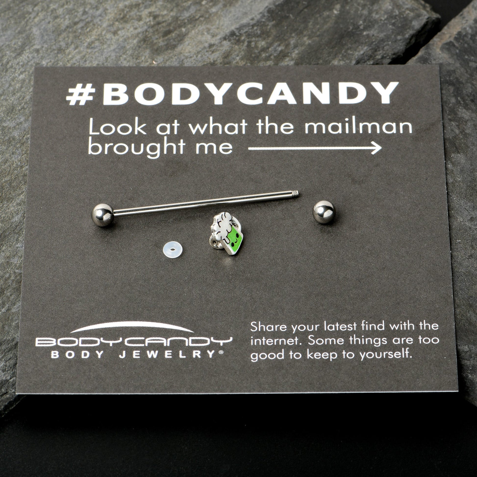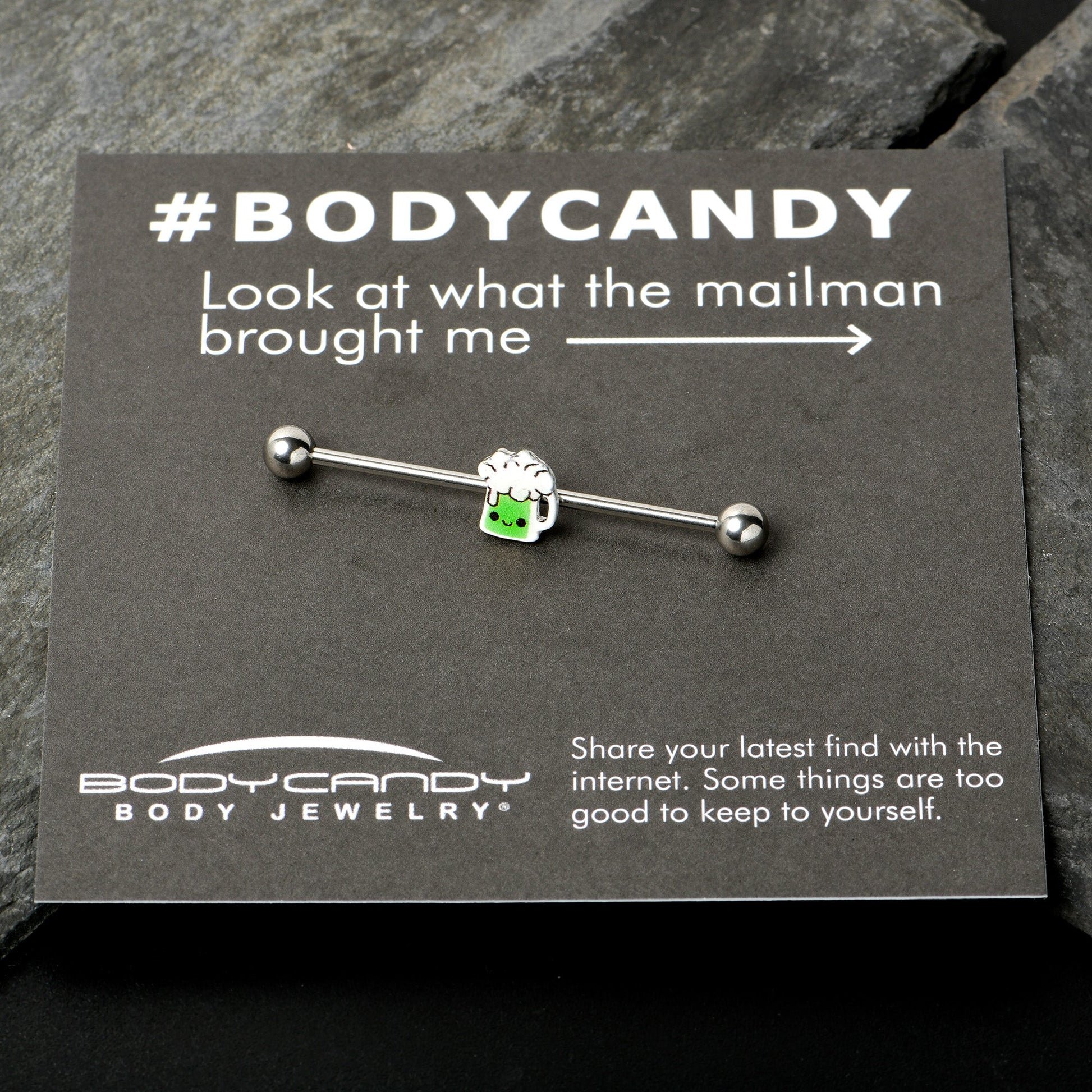 This St Patrick's Day, belly up to the bar with this 14 gauge helix barbell! It's made with a 1 1/2" durable 316L surgical grade stainless steel straight barbell with 5mm ball ends. It features a green beer charm with white detailing and a happy, smiling expression. You can even slide it up and down the length of the barbell for the perfect look! If you're looking for a bit of green to wear this St. Patrick's Day, have no fear - we've got some beer for your piercings with this festive barbell earring!Specifications