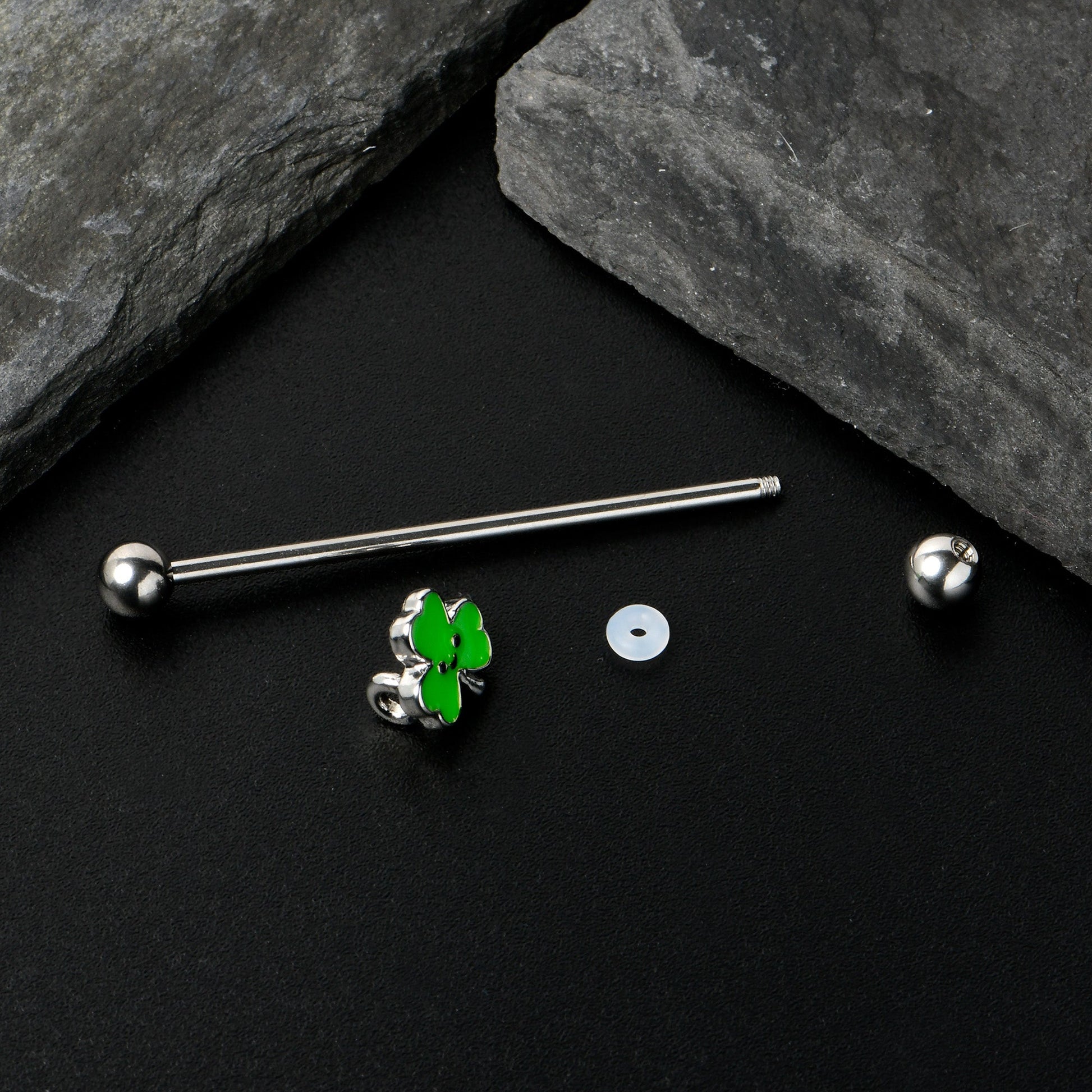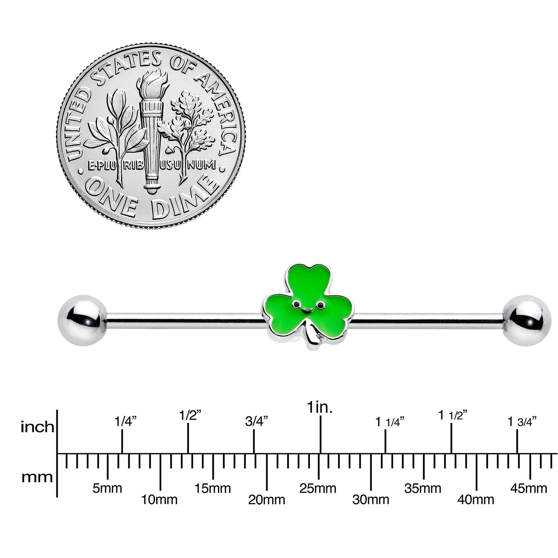 Get lucky with this 14 gauge shamrock helix barbell! It's made with a 1 1/2" durable 316L surgical grade stainless steel straight barbell with 5mm ball ends. It features a green shamrock charm with a winningly cheerful face at the center. You can even slide it up and down the length of the barbell for the perfect look! Whether you're celebrating St Patrick's Day, expressing your love of all things Irish, or simply need a little luck, this lucky shamrock barbell earring is sure to leave you feeling like a winner!Specifications