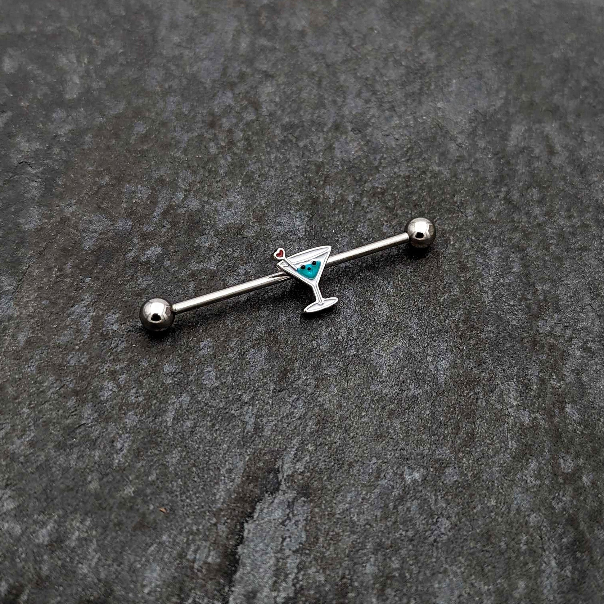 Bottoms up for style, with this 14 gauge helix barbell! It's made with a 1 1/2" durable 316L surgical grade stainless steel straight barbell with 5mm ball ends. It features a martini glass charm, with blue embellishment and a heart-ended swizzle stick. It also features a face on the glass and you can slide it up and down the length of the barbell for the perfect look. Drink in the compliments when you're rocking this cocktail-themed barbell earring!Specifications