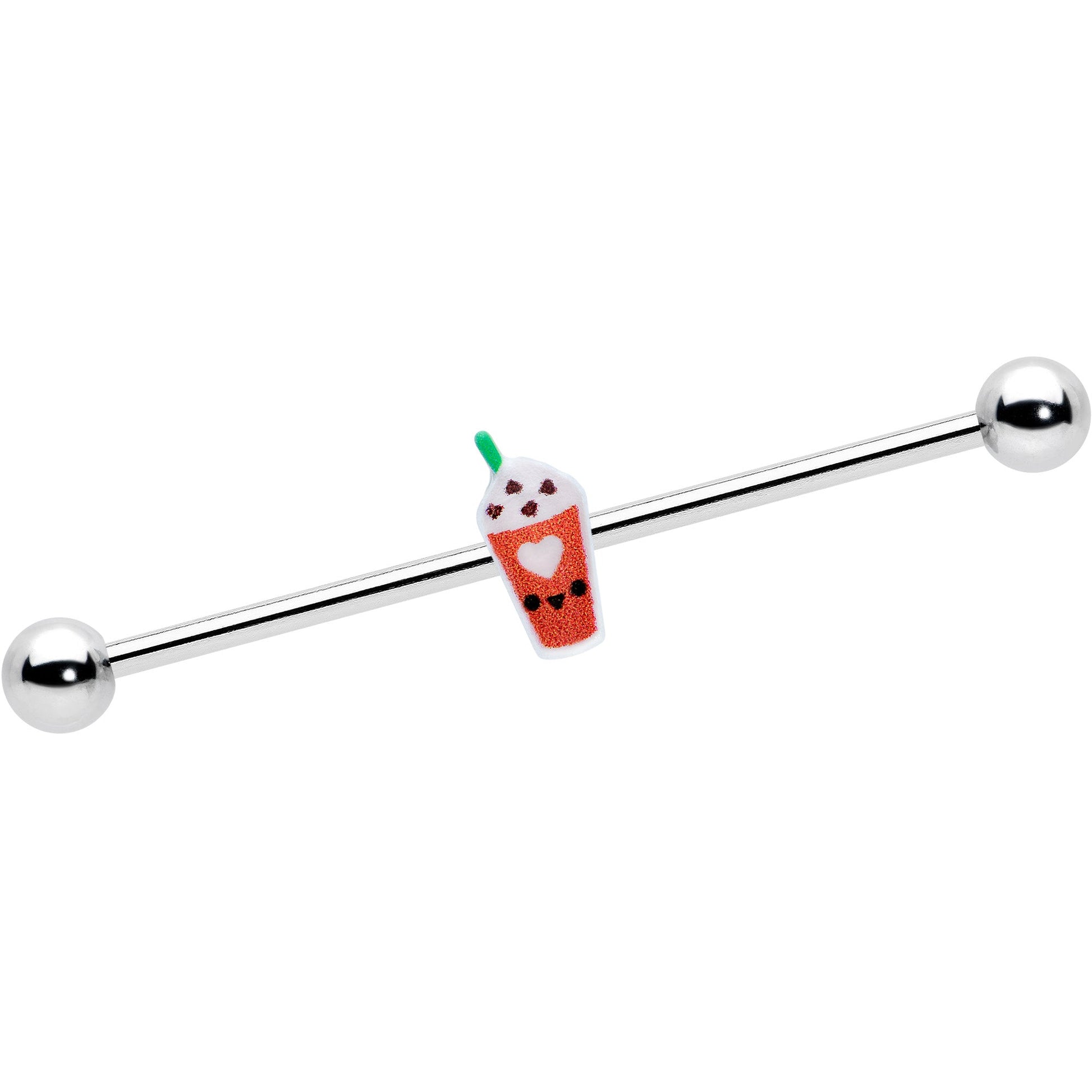 This is one sweet treat you won't want to eat, when you're rocking this 14 gauge helix barbell! It's made with a 1 1/2" durable 316L surgical grade stainless steel straight barbell with 5mm ball ends. It features a kawaii-inspired pumpkin frappe charm, inlaid in Fall colors, with a charming green straw, and sporting a heart on its label. You can even slide it up and down the length of the barbell for the perfect look! Get a cool look during the cold days of fall with this yummy pumpkin frappe barbell earring!Specifications
