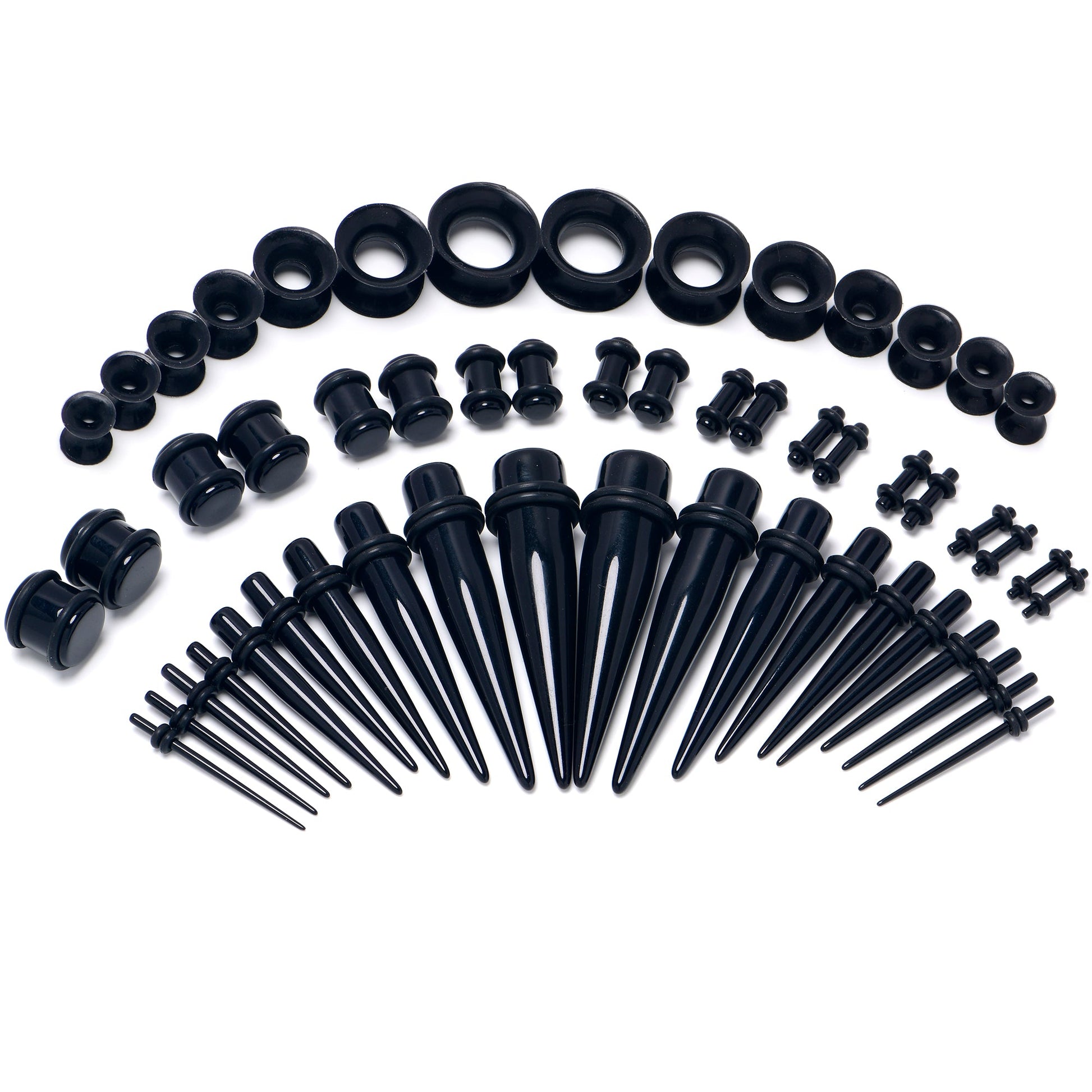 54 Total Pieces; includes 1 set of Each Size and a 5ml bottle of Natural Jojoba Oil. Acrylic Plugs and Tapers (w/rubber O-Rings) 14 Gauge (1.6mm), 12 Gauge (2mm), 10 Gauge (2.5mm), 8 Gauge (3mm), 6 Gauge (4mm), 4 Gauge (5mm), 2 Gauge (6mm), 0 Gauge (8mm), 00 Gauge (10mm) and 1/2" (12mm); Silicone Tunnels 8 Gauge (3mm), 6 Gauge (4mm), 4 Gauge (5mm), 2 Gauge (6mm), 0 Gauge (8mm), 00 Gauge (10mm) and 1/2" (12mm)