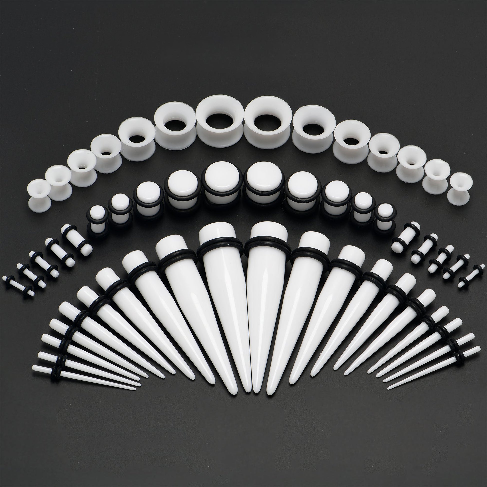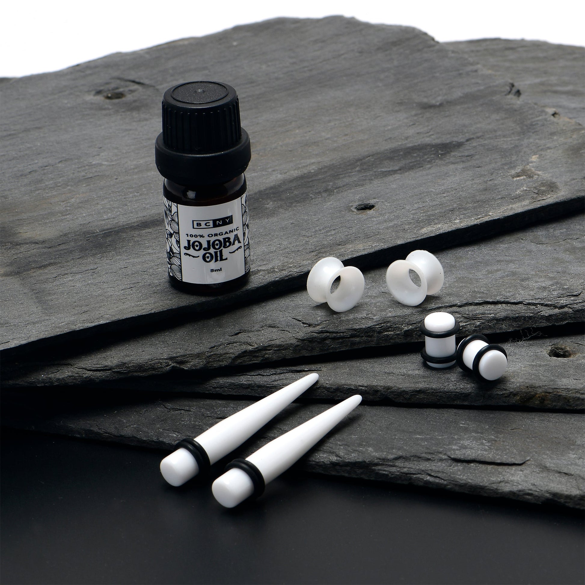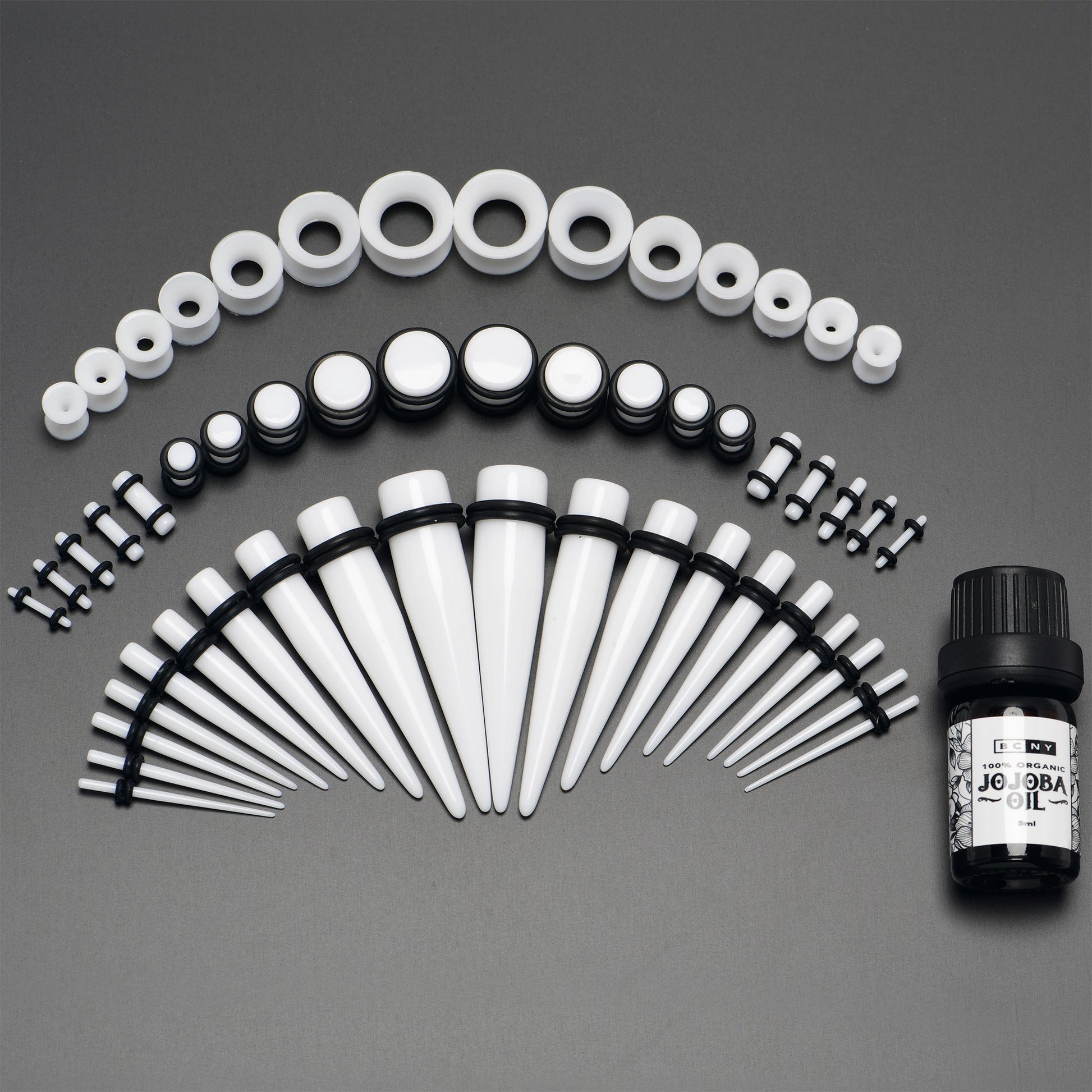 Hypoallergenic jewelry for sensitive skin.14 Gauge to 1/2 White Acrylic 54 Piece Ear Stretching Kit with Jojoba Oil