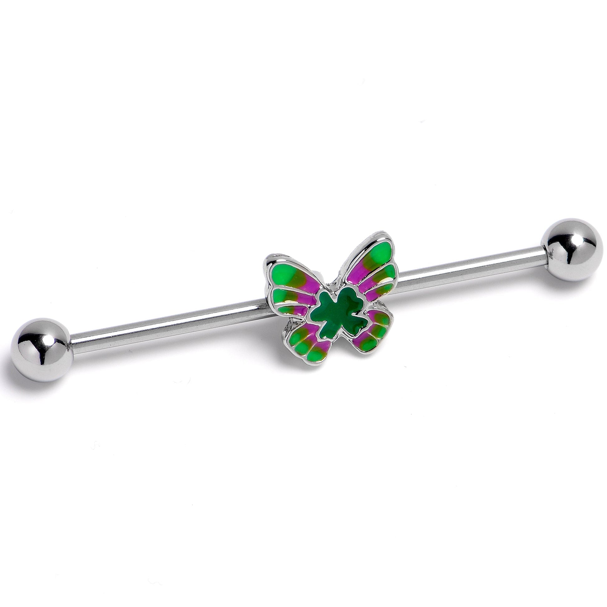 Spread your wings for luck with this 14 gauge helix barbell. It is made with a 1 1/2 inch 316L surgical grade stainless steel straight barbell with 5mm ball ends. It features a butterfly charm, with the wings striped in pink and green. At the center of the butterfly is a matching green inlay shamrock for an added touch of color and cottagecore style and you can slide it up and down the length of the barbell for the perfect look. You will be feeling the love and the luck when you are are rocking this butterfly barbell earring.Specifications