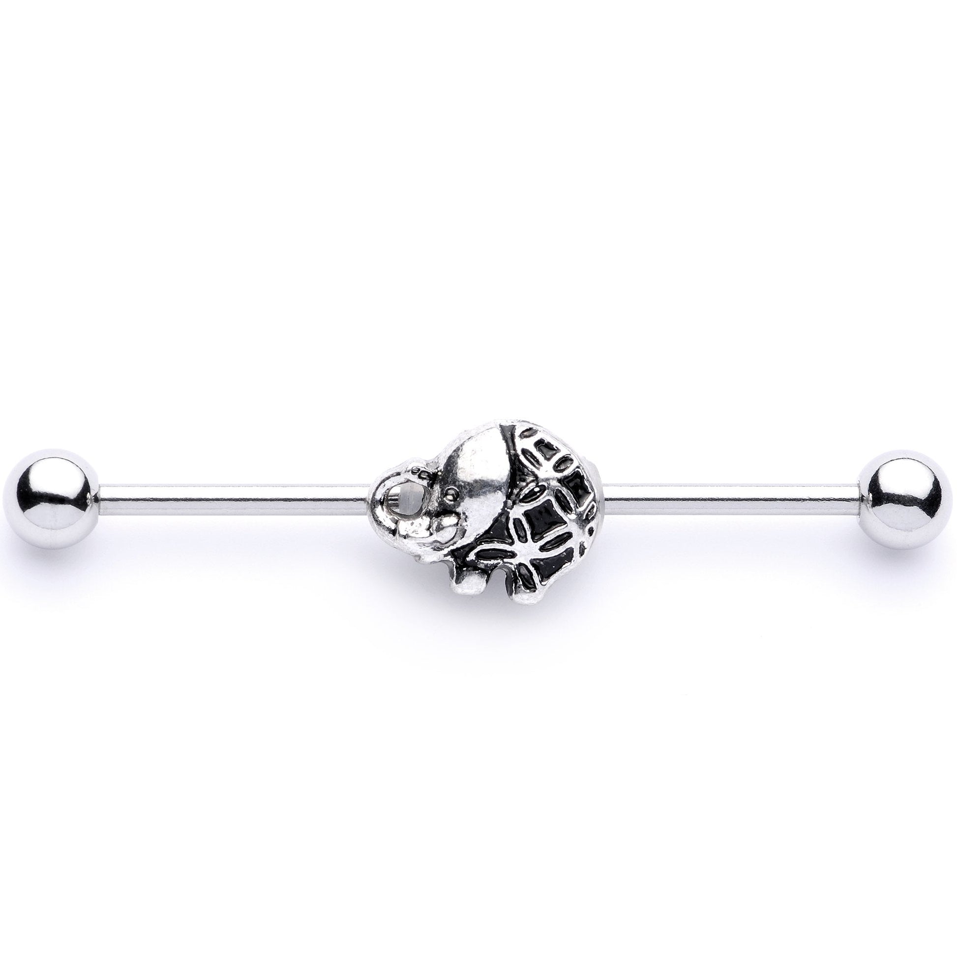 This round little elephant is sure to bring a smile to your face while bringing some adorable style to your industrial piercing! This 14 gauge industrial earring is made with a 1 1/2" durable 316L surgical grade stainless steel straight barbell with 5mm ball ends. It features a rounded elephant, his body embellished with a flowery design against a darker antiqued background. Even his legs and turned-up trunk contribute to his circular form, giving him a sweet and loveable appearance. And he can be slid up and down the length of the barbell so you can get just the look you want. An elephant with an upturned trunk is said to be a good luck charm - and you'll certainly feel lucky to have such a charming piece of body jewelry in your piercing!Specifications